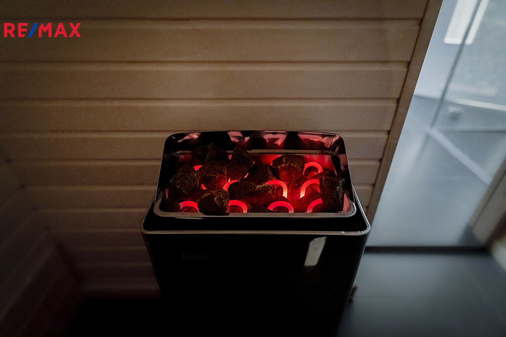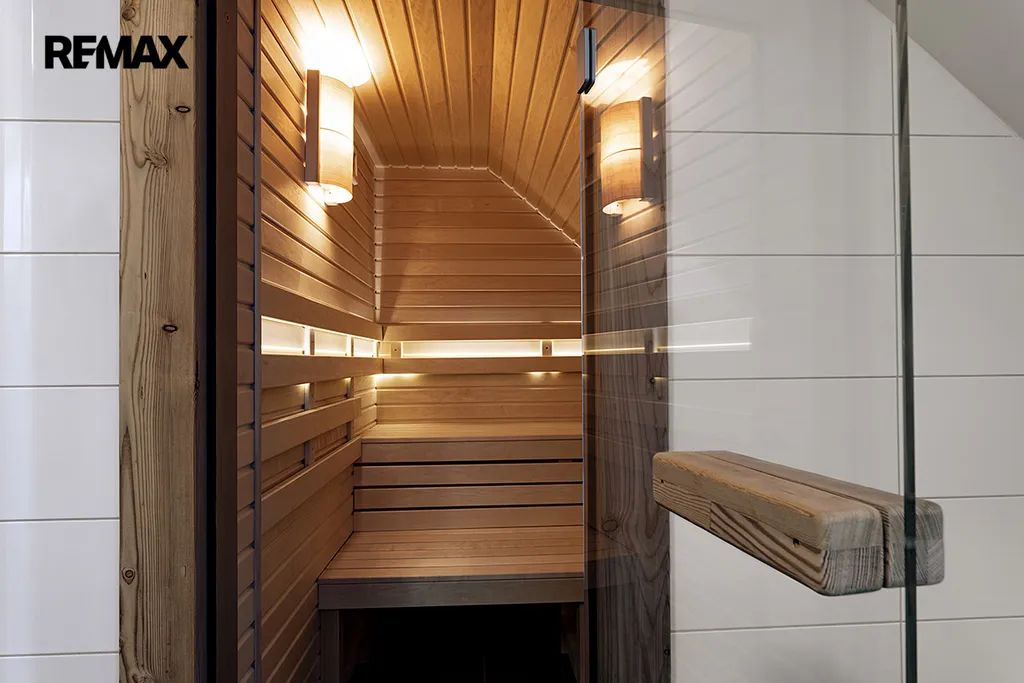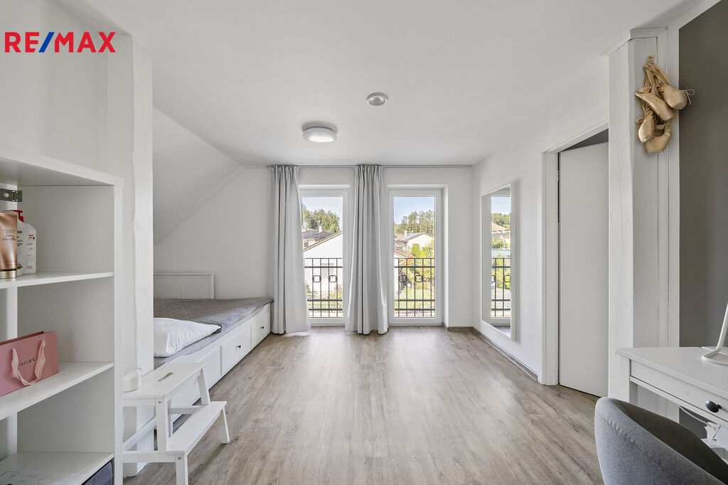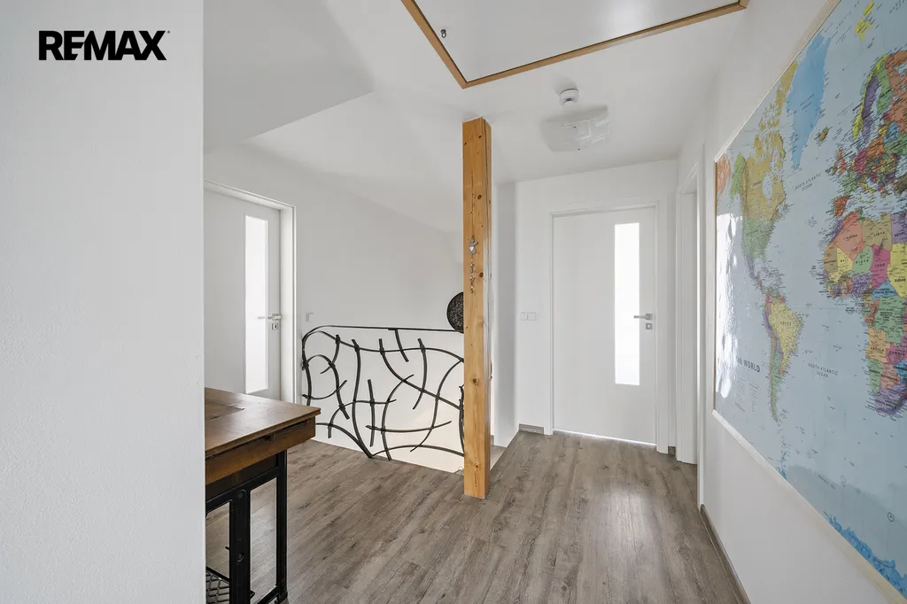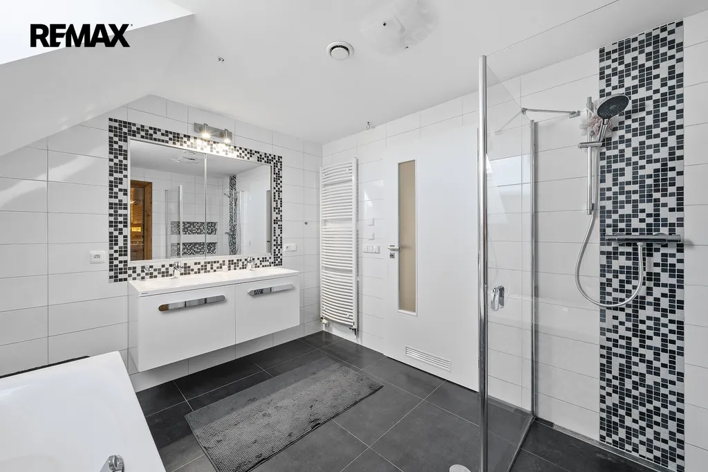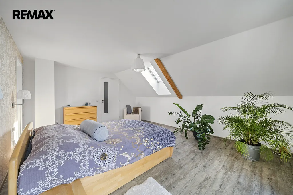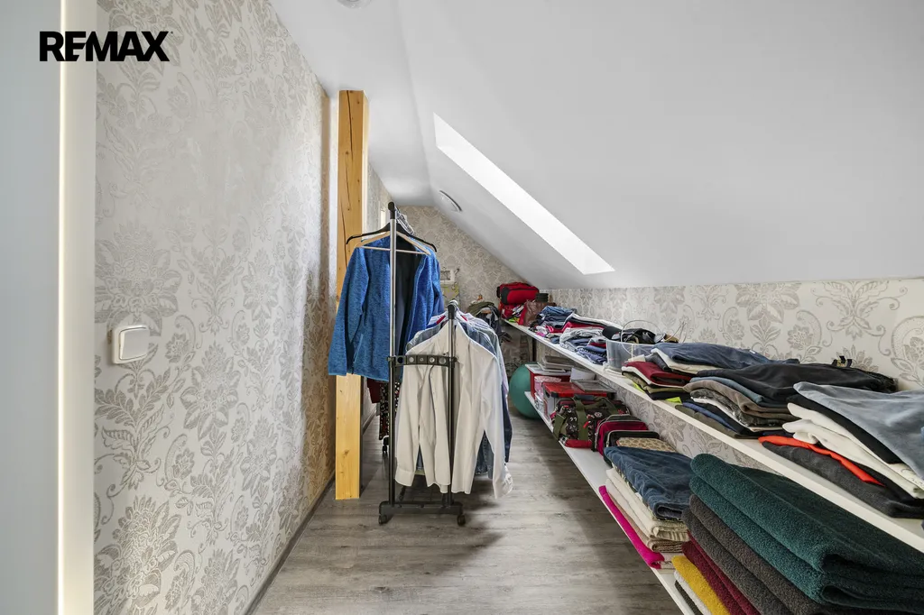 V patře domu jsou dva samostatné a prostorné pokoje, hlavní ložnice, kde každý pokoj má vlastní šatnu. Šatnám dodává světlo střešní okna. K dispozici je také samostatné WC a luxusní koupelna s vanou, sprchovým koutem, dvojumyvadlem a profesionální finskou saunou. Součástí domu je i půdní prostor přístupný skládacími schody, využitelný jako úložný.