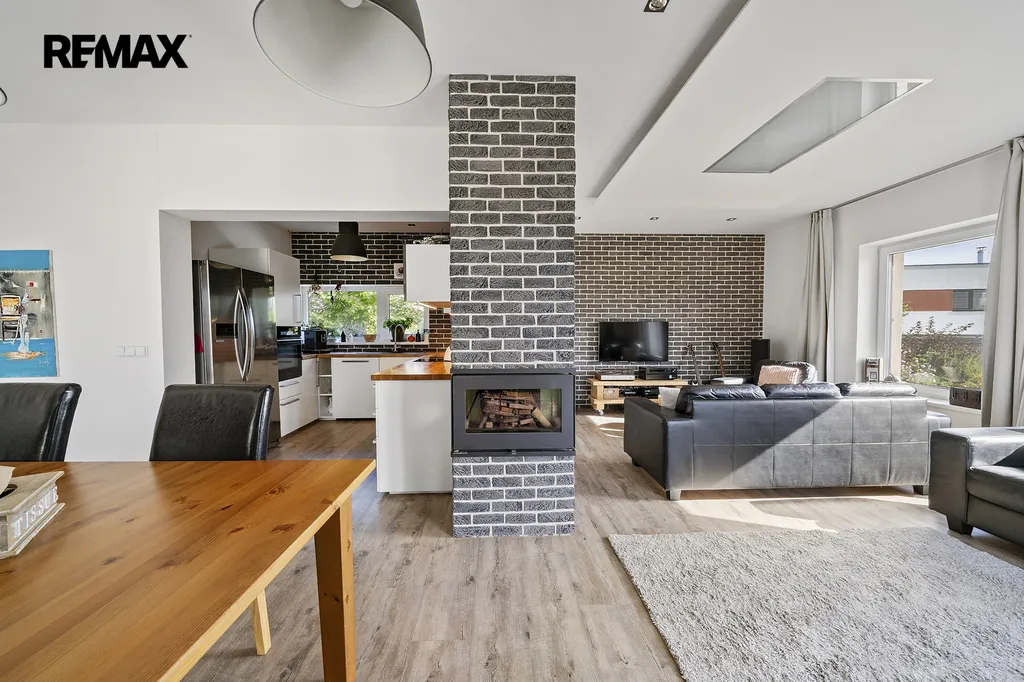 Podlahové topení v celém domě (plynový kotel + bojler, dva komíny – pro krb i kotel). Krbová vložka Rais 500. Vinylové podlahy, bezprahové řešení, betonové stropy. Kompletní rozvody internetu v každém pokoji, příprava na rekuperaci i venkovní ozvučení terasy. Před domem parkování až pro 6 aut. Dům sbírá dešťovou vodu, která je využívána na splachování toalet a zálivku zahrady s připojením na třech místech domu.