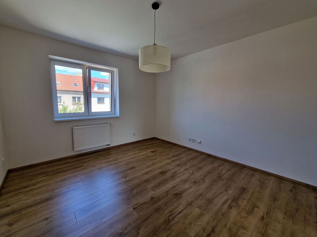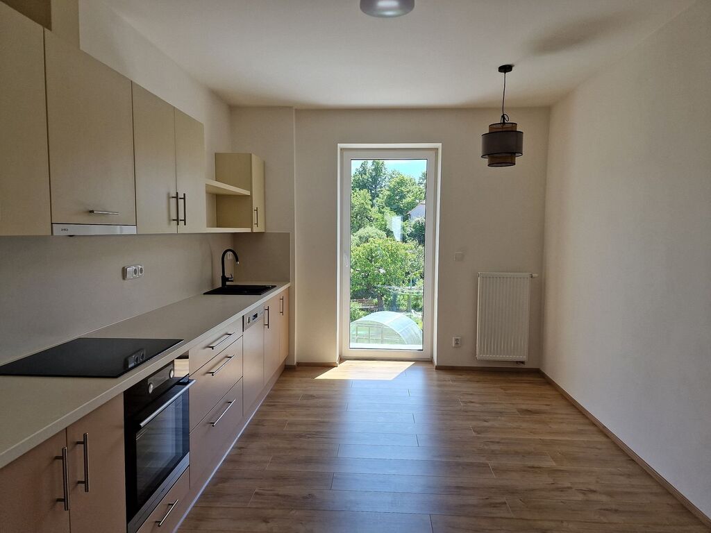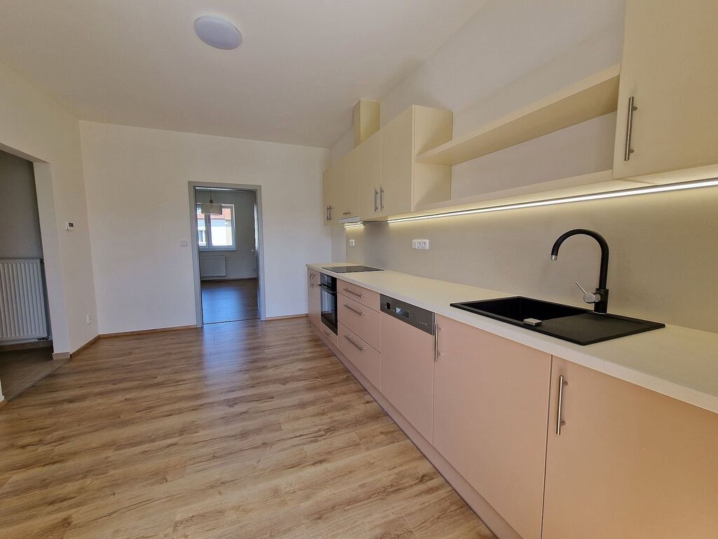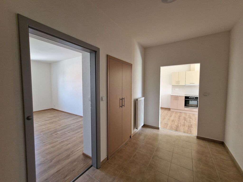 Po vstupu do bytu Vás příjemně překvapí moderní a svěží design bytu. V kuchyni je nová kuchyňská linka, která je vybavena vestavěnými spotřebiči jako je elektrická varná deska, elektrická trouba, myčka na nádobí a digestoř. Předností této kuchyně je dostatek prostoru i pro jídelní kout. Obývací pokoj navazuje na kuchyň a tím nabízí praktické využití obytných prostor. Na zastřešeném balkóně o výměře cca 2 m2 s výhledem do zeleného vnitrobloku je možné trávit chvíle relaxace. Do ložnice se vstupuje samostatným vstupem z předsíně. V prostorné koupelně se sprchovým koutem a umyvadlem je příprava a místo pro umístění pračky. Na stěně je topný žebřík. Toaleta je samostatně. Ve vstupní hale je umístěna vestavěná skříň a je zde dostatek místa pro šatní věšák, zrcadlo atd. Zajímavostí je velmi praktická, samostatná, zděná komora. V celém bytě jsou svítidla. Podlahu kryje laminátová plovoucí podlaha nebo dlažba.
