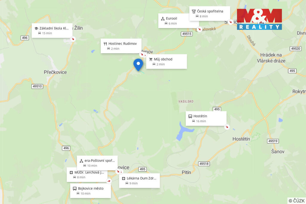 Pozemek je obklopen přírodou, nabízí klid a soukromí a zároveň dobrou dopravní dostupnost do okolních měst a obcí. Do lázeňských Luhačovic je to přibližně 13 km (15–20 minut jízdy), Bojkovice jsou vzdálené 7 km (cca 9 minut), Slavičín s kompletní občanskou vybaveností leží 5 km (cca 6 minut) a do krajského města Zlína se dostanete za přibližně 40 minut (cca 34 km).