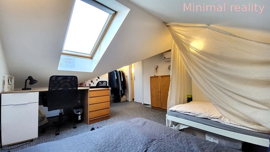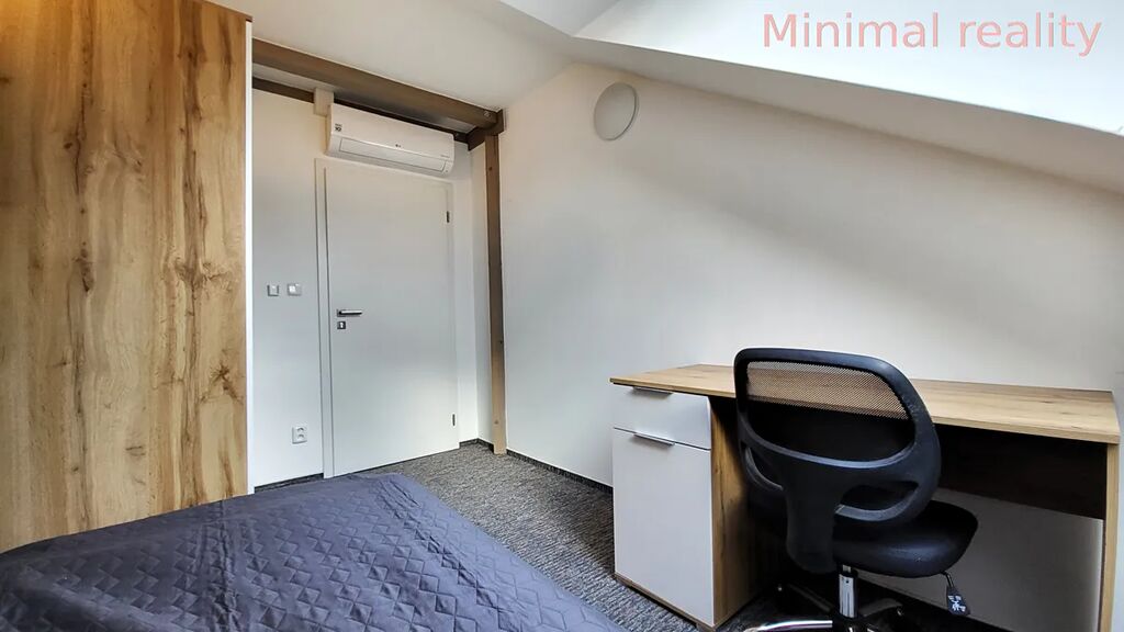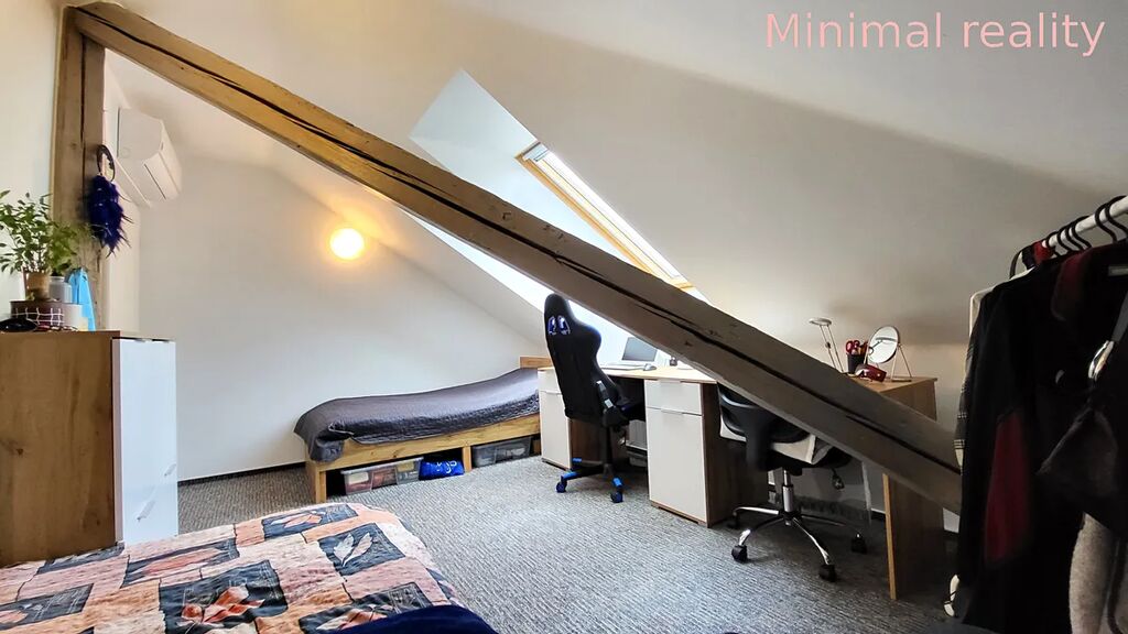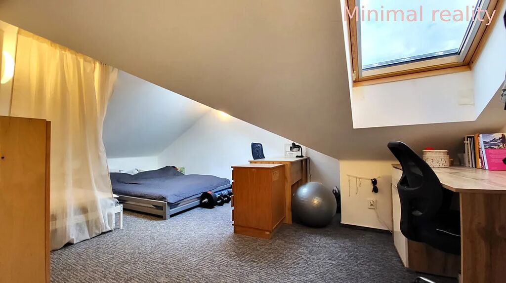 Z chodby s botníkem, věšákem, šatní skříní a zrcadlem je vstup po dřevěném schodišti z masivu do čtvrtého podkrovního pokoje. Pokoj je od schodiště oddělen posuvnými dveřmi a je vybaven manželskou postelí a dvěma pracovními stoly.