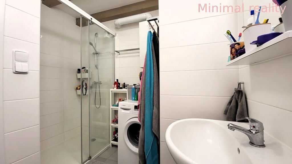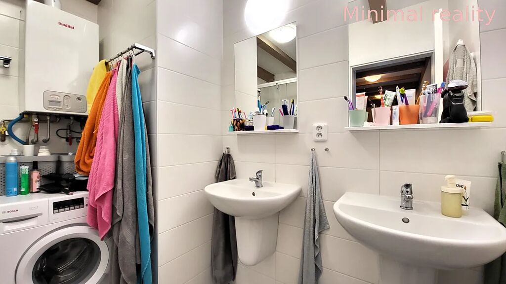 Koupelna je vybavena sprchovým koutem se skleněnými posuvnými dveřmi, dvěma umyvadly a zrcadly, pračkou značky BOSH a ventilátorem. Toaleta je samostatná.