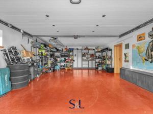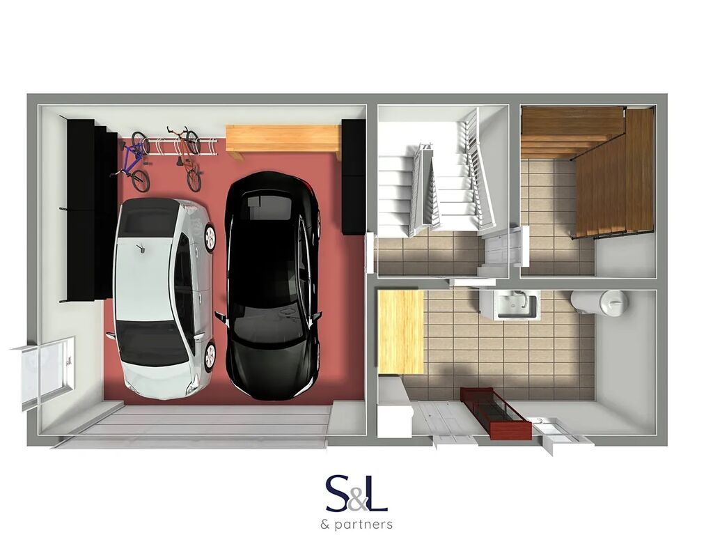 • Suterén (67,27 m²): chodba se schodištěm, prostorná dvojgaráž (39,05 m²), sklad potravin a zahradní sklad s technickým zázemím. Strop v garážové části tvoří železobetonové panely Alidal, doplněné o ocelový průvlak a vytápění je vedené po obvodu. Ve zbytku suterénu je stropní konstrukce realizována v systému POT – MIAKO s monolitickou nadbetonávkou.