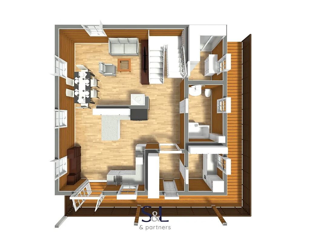 • Přízemí (93,89 m²) nabízí zádveří, prádelna s úložným prostorem, koupelnu s WC, šatnu a prostornou pobytovou halu se schodištěm, na kterou navazuje kuchyň, jídelna a obývací pokoj. Součástí přízemí je také přímý vstup na krytou terasu o velikosti 33,6 m², ideální pro relaxaci nebo posezení s výhledem do zahrady. Nad přízemím je viditelná dřevěná trámová konstrukce.