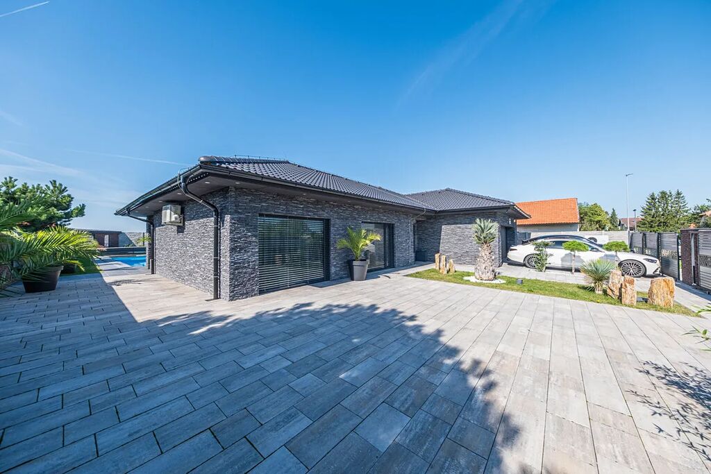 Bungalov o velikosti 6+kk a garáží pro dva automobily a zázemím pro všechny náročné nadšence, kteří chtějí mít v domě svůj vlastní pánský prostor, 11ti metrovým krytým vyhřívaným bazénem, v něm vsazeném sezení, vířivkou pro šest osob a všemi nejmodernějšími technologiemi, které současný trh nabízí, má žitnou plochu 241,3 m² a celkovou zastavěnou plochu krásných 288 m². Dům leží na pozemku o výměře 892 m².