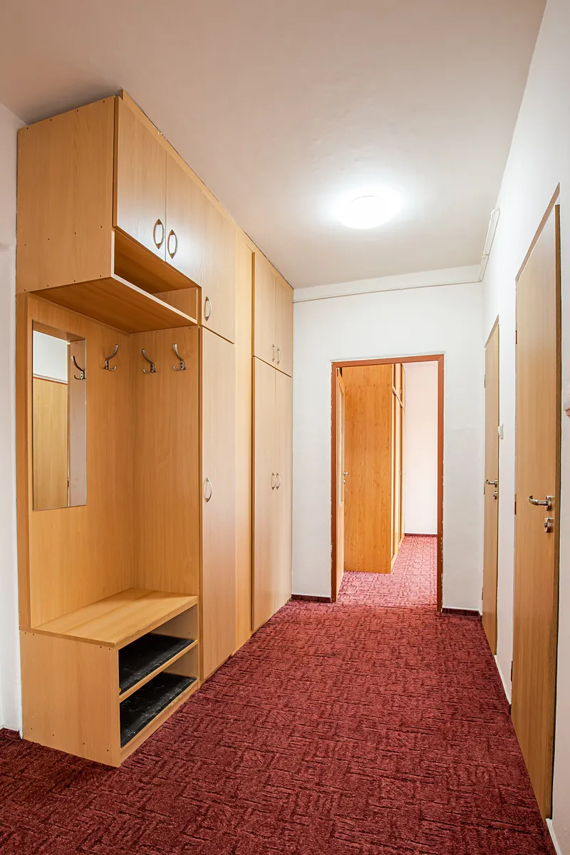 Pokoje jsou neprůchozí, přístupné z předsíně, ve které je umístěna na míru zhotovená stěna s dostatkem úložných prostorů.