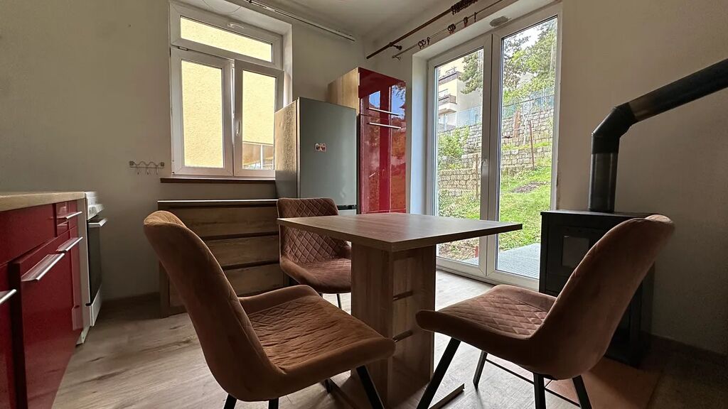 Pronájem bytu 1+kk v centru Luhačovic s vlastní zahradou s přímým přístupem z pokoje. Nachází se v 1. patře prvorepublikové vily. Byt sestává ze vstupní choby, pokoje s kuchyňskou linkou, sporákem, troubou, lednicí, dále je k dispozici stůl s židlemi, manželská postel, skříň, komoda, koupelna vanou a WC. Vytápění infrapanely + krbová kamna. Výměra 30 m2, slunná zahrada s ovocnými stromy o výměře 212 m2. Výborná poloha! K nastěhování od 1. 11. 2025.