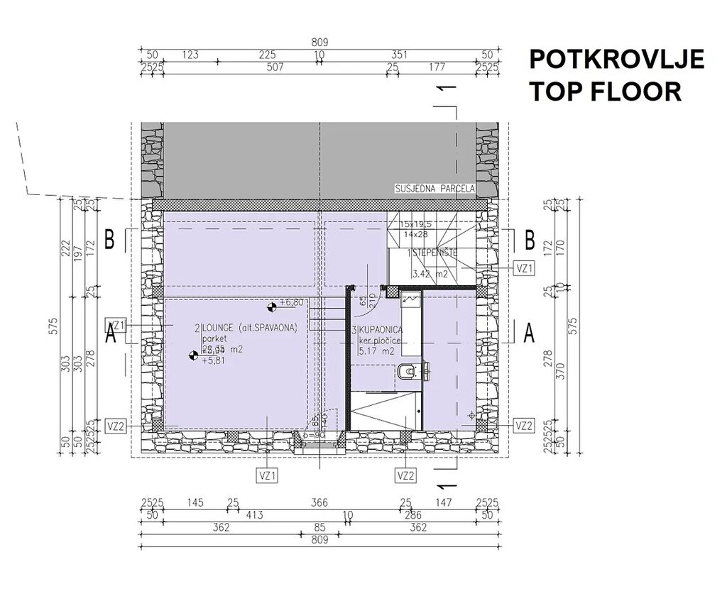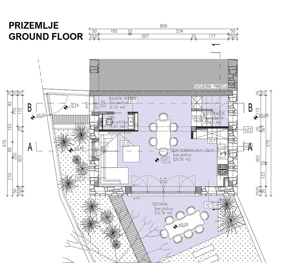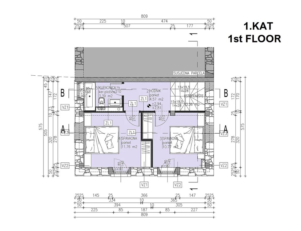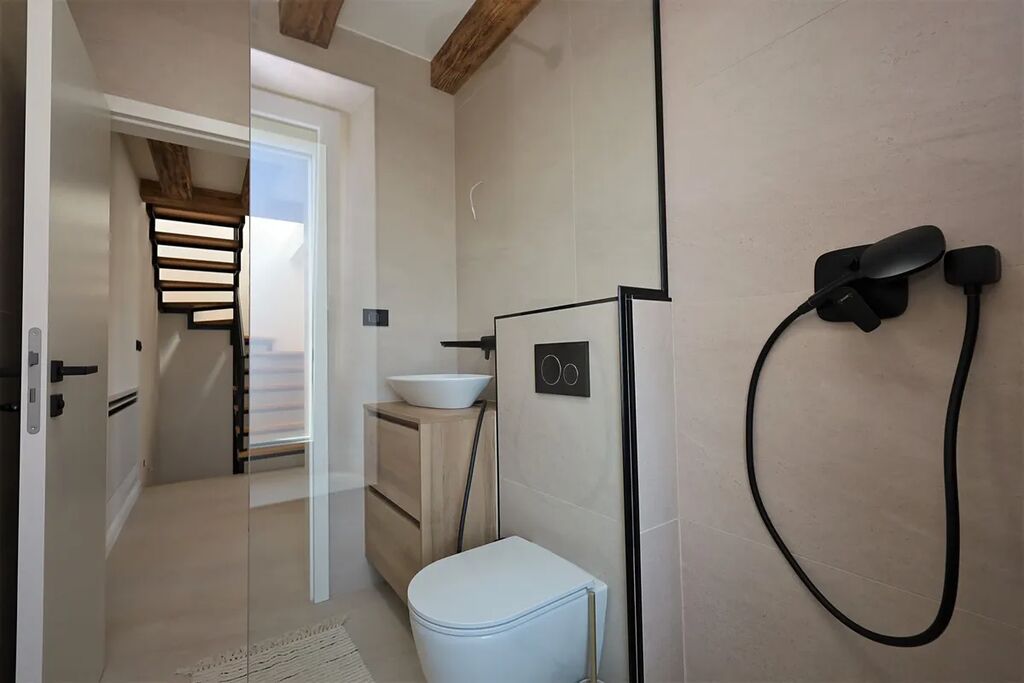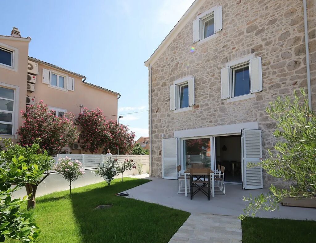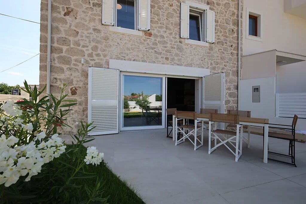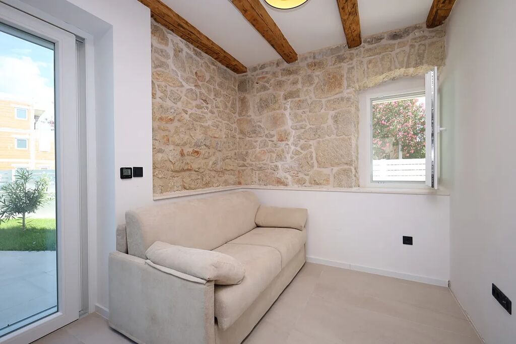 V centru Vodice, 240 m od oblíbené Modré pláže nabízíme k prodeji kouzelný kamenný dům po velmi zdařilé kompletní rekonstrukci, perfektní kombinace tradičního dalmatského kamenného stylu a moderního designu. Dům má 108,64 m² užitné plochy, rozložené na třech podlažích (přízemí + 1. patro + vysoké podkroví). Byl postaven na pozemku o rozloze 240 m², s oploceným dvorem, prostorným parkovacím místem pro 3 auta a skladem/sklepem v suterénu pod parkovištěm. V přízemí se nachází vstupní hala, toaleta pro hosty, kuchyň s jídelnou a obývací pokoj s přístupem na krytou terasu o rozloze 17 m². V prvním patře se nacházejí dvě ložnice, chodba a koupelna, zatímco ve vysokém podkroví se nachází kotelna, další koupelna a prostorná ložnice s výhledem na moře. Dům je vybaven plastovými a Velux okny, "chytrým" Wi-Fi systémem, elektrickými vstupními dveřmi a kvalitními interiérovými dveřmi. Vytápění je podlahové (tepelné čerpadlo) a chlazení systémem fan coilerů. Sanitární keramika je Hansgrohe, schodiště je obloženo dubovým dřevem. Nemovitost je kompletně zařízená – moderní kuchyňská linka DanKuchen se spotřebiči, koupelnový nábytek a vestavěné skříně – ihned k nastěhování bez dalších investic.