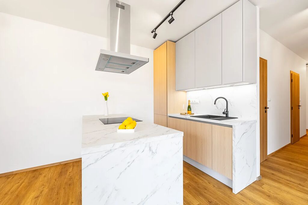 Byt vypadá přesně jak vidíte na fotografiích, nejedná se o vizualizaci. V bytě je krásná kuchyně s ostrůvkem vyrobena na míru a vybavena spotřebiči (el. trouba, myčka, mikrovlnná trouba, indukční deska, digestoř). V koupelně je vana, sprchový kout, příprava na pračku, designové umyvadlo na praktické skříňce se dvěma zásuvkami a navíc podlahové vytápění. Byt je dispozičně velmi dobře řešený se dvěma velkými neprůchozími ložnicemi s krásným výhledem, prostorným obývacím pokojem s kuchyní s předokenními žaluziemi, opravdu prostornou koupelnou a samostatnou toaletou, technickou místností a velkou chodbou s dostatkem místa na vestavěnné stříně. K bytu náleží velký balkon/terasa a větší parkovací stání v podzemní garáži.