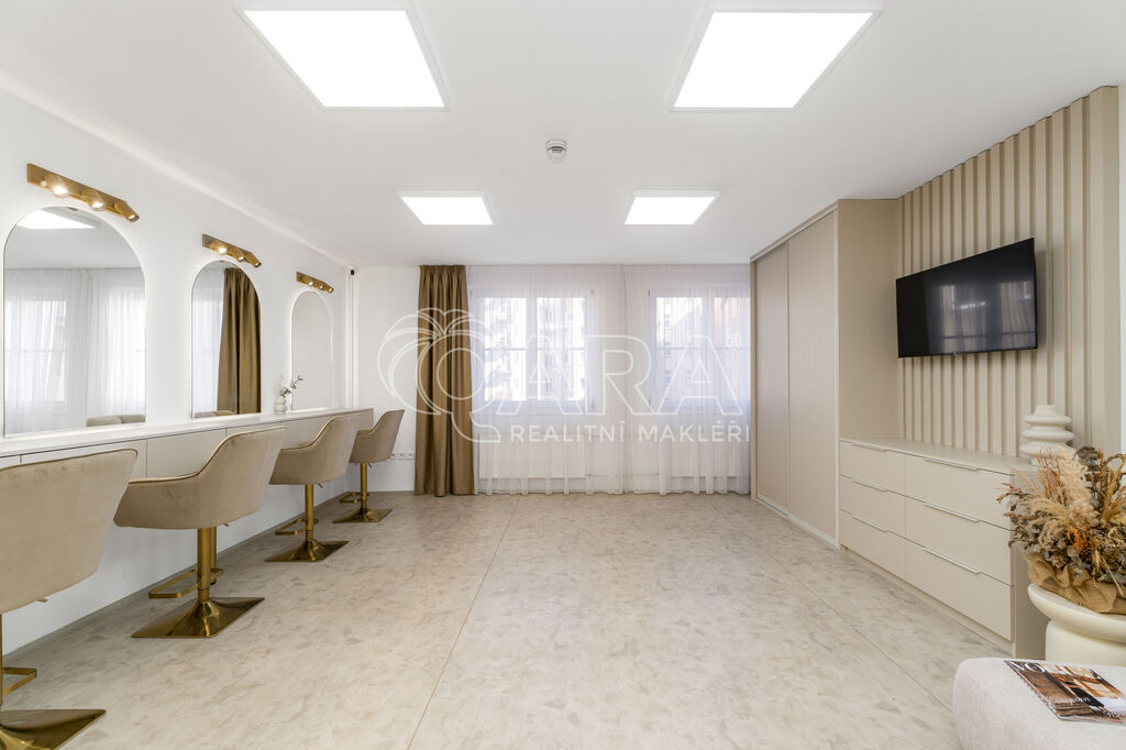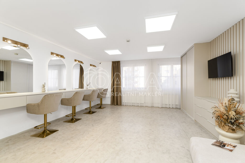 Vybavení: K dispozici je také praktická skříň a komoda pro uložení pracovních pomůcek či textilií, stejně jako záclony a závěsy, které dotvářejí příjemnou a profesionální atmosféru salonu. Křesla a zrdcadla nejsou zahrnuty v ceně, ale je možné jej odkoupit nebo pronajmout. Pokud by vám tento prostor nevyhovoval, na stejném podlaží máme k dispozici také druhý — podívejte se na naši nabídku v inzerci.