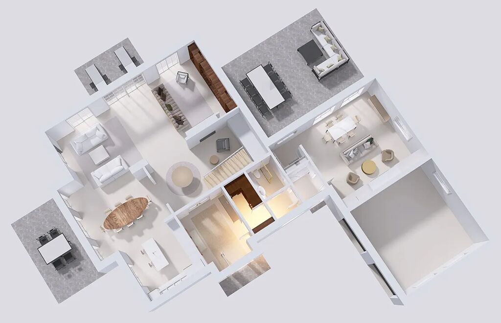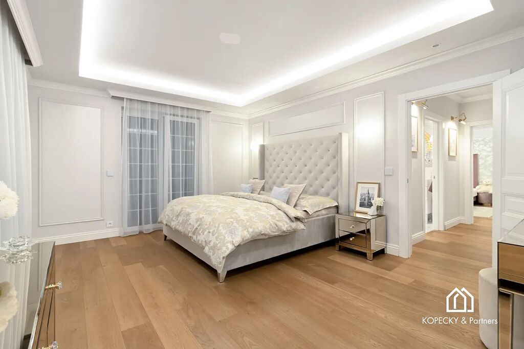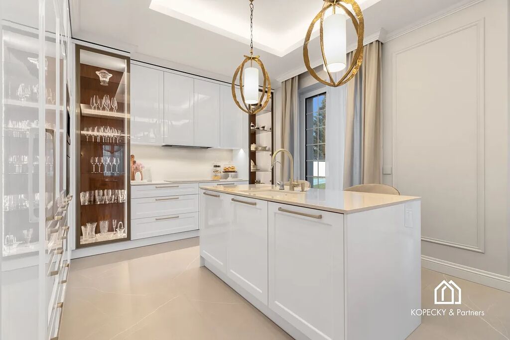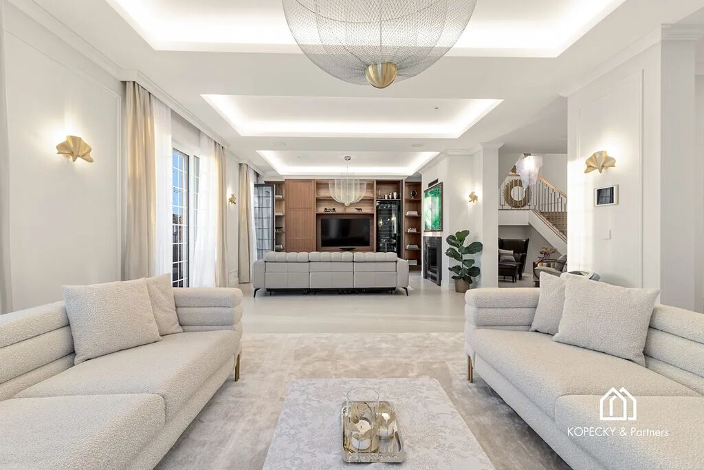 Celý dům je zařízen v duchu sofistikované elegance – od ikonických svítidel navržených Zahou Hadid, přes jídelní stůl Bonaldo pro deset hostů, až po nábytek a osvětlení od značek Eichholz, Moooi či Cattelan Italia. Každý detail byl pečlivě vybrán tak, aby tvořil harmonický celek.