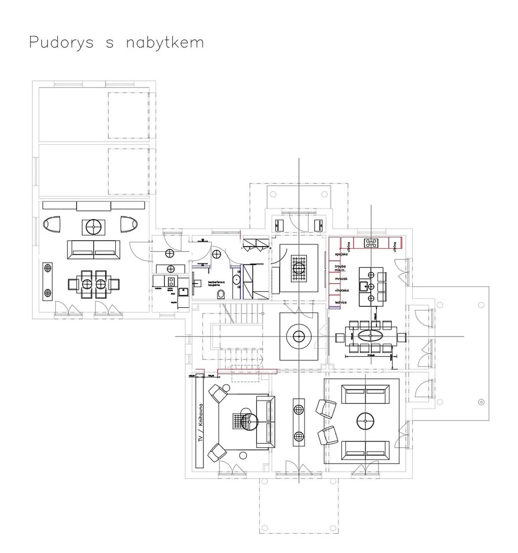 Dominantou přízemí je otevřený obytný prostor s vysokými stropy, kde se setkává kuchyň, jídelna, obývací pokoj i odpočinková zóna s barem a krbem. Velkoformátová okna přivádějí do interiéru denní světlo a otevírají výhledy na zahradu s bazénem. Kuchyňská část je vybavena spotřebiči Miele a doplněna snídaňovým barem i luxusními úložnými prvky z masivního ořechového dřeva. Součástí přízemí je také samostatná bytová jednotka s vlastní kuchyňkou a koupelnou.
