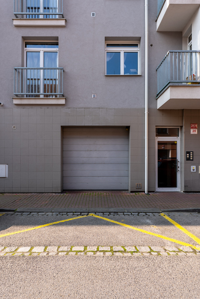 Možnost koupě garážového stání přímo v domě – bezpečné a pohodlné parkování přes dálkově ovládaná vrata, suchou nohou výtahem rovnou k bytu. Stání může zároveň sloužit jako další úložný prostor.