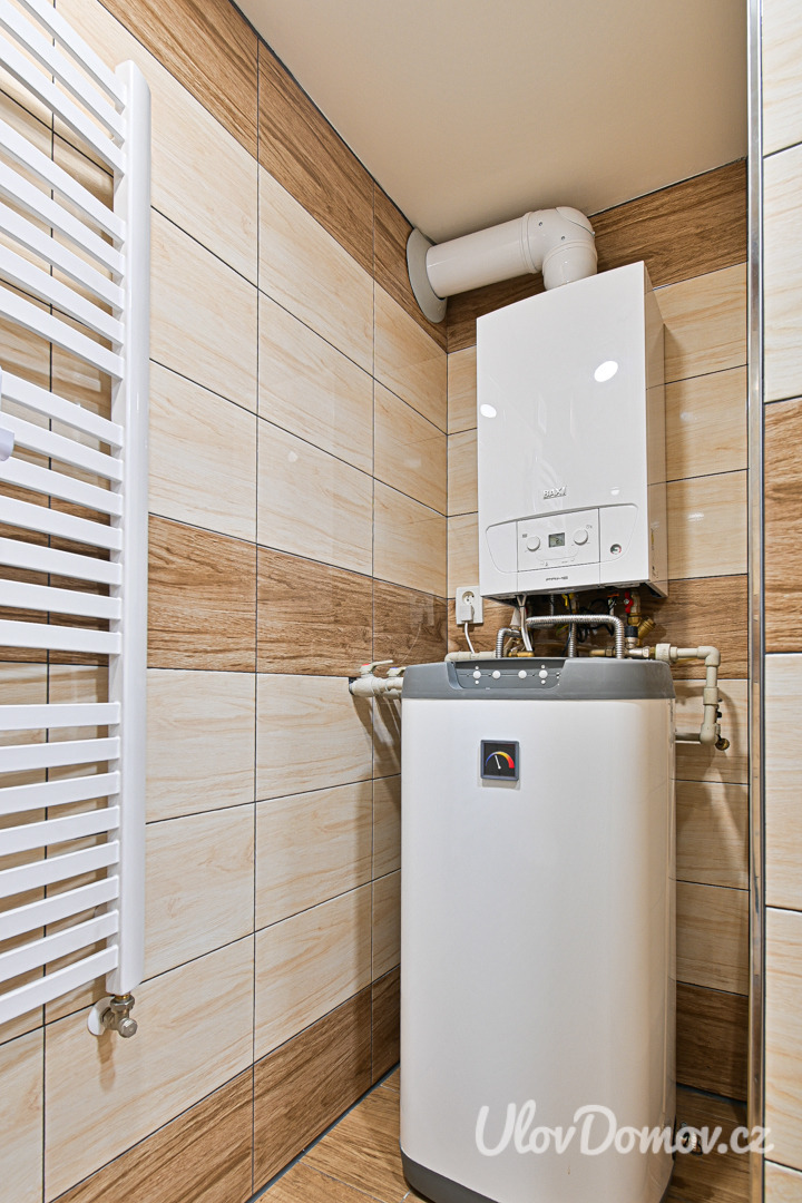 Dům je vytápěn etážovým plynovým kotlem s rozvodem vody do podlahy v přízemí, v patře jsou radiátory. Ohřev TUV zajišťuje plynový kotel.
