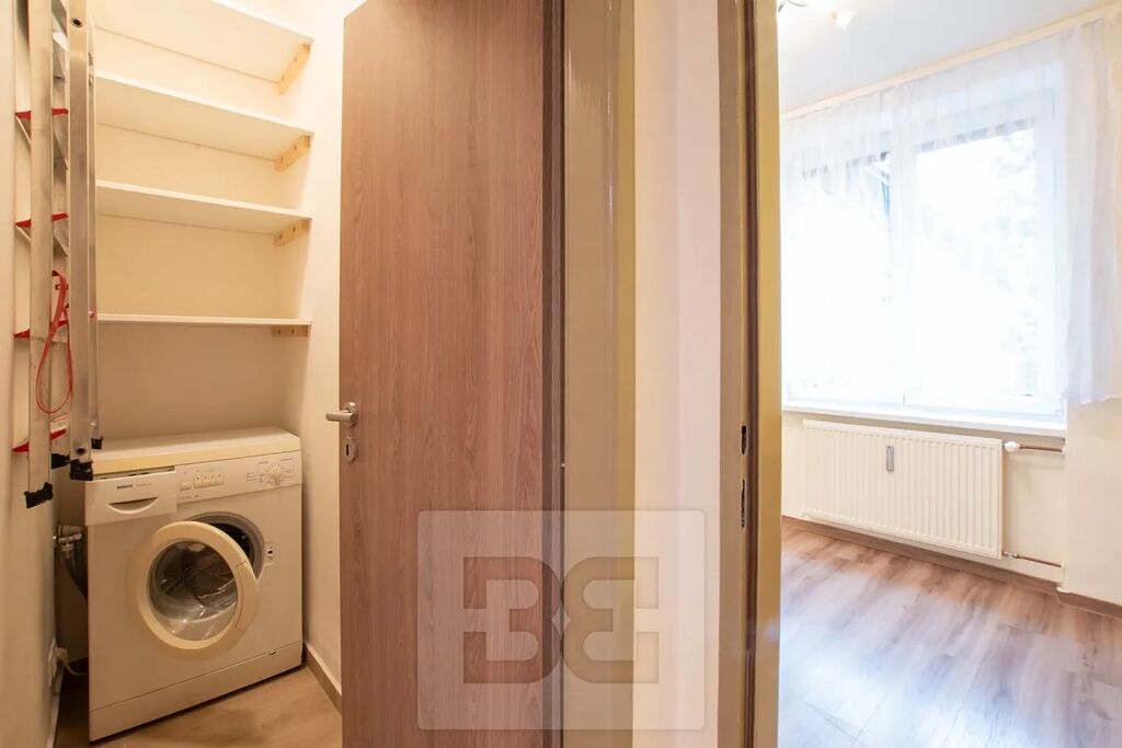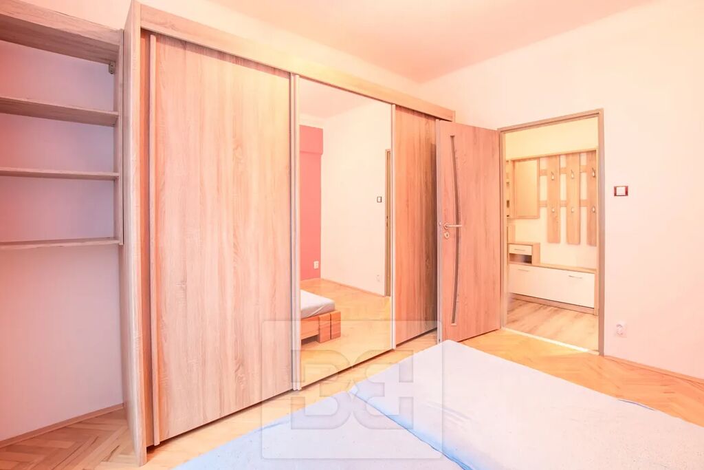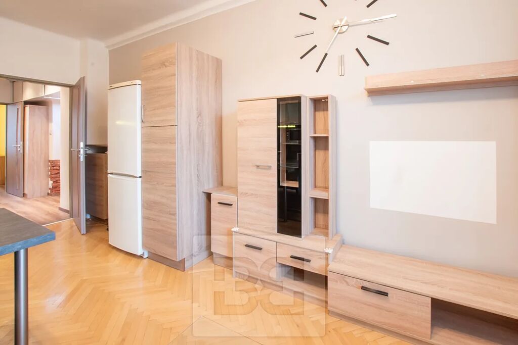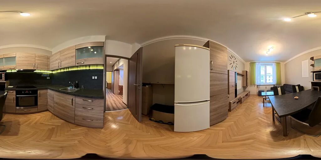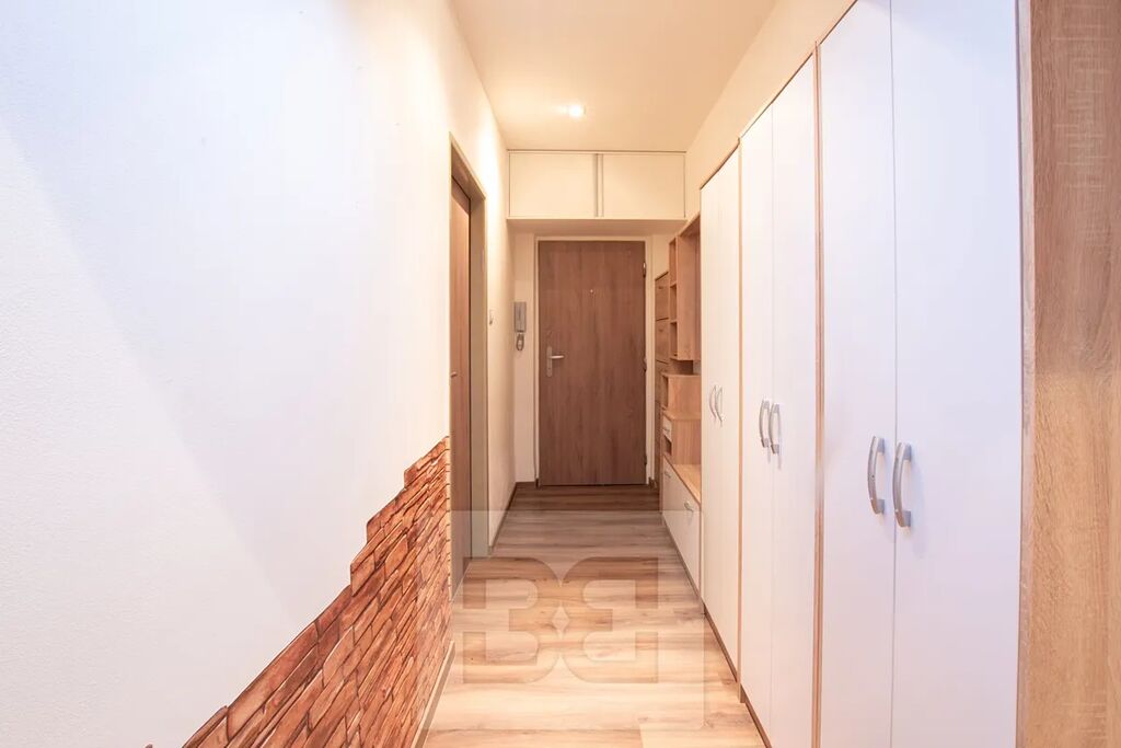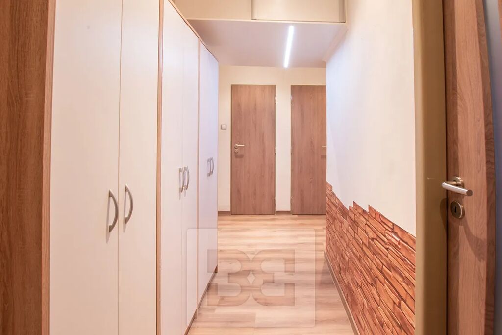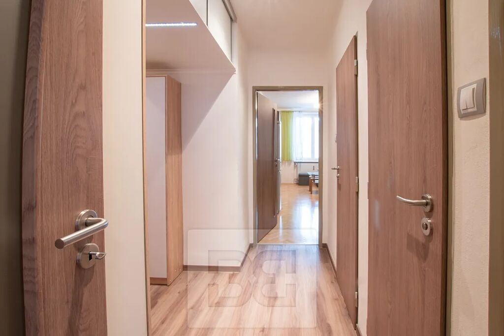 Byt je světlý, s dřevěnými podlahami v obývací místnosti a kvalitním vinylem v ostatních místnostech. Kuchyňský kout je vybaven moderní linkou se spotřebiči, včetně lednice s mrazákem, varné desky, trouby, digestoře a mikrovlné trouby. Dále v obývací místnosti najdeme rozkládací pohovku, jídelní stůl a obývací stěnu. V bytě se nachází dva samostatné pokoje. Jeden z nich nebízí pracovní stůl, ve druhém najdeme šatní skříň a prostornou postel. V koupelně najdeme vanu. Toaleta je umístěna samostatně. Součástí bytu je také prostorná komora, která může sloužit jako šatna nebo úložný prostor, zde najdeme úložný systém polic a pračku. V předsíni jsou další skříně.