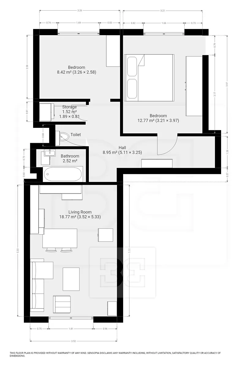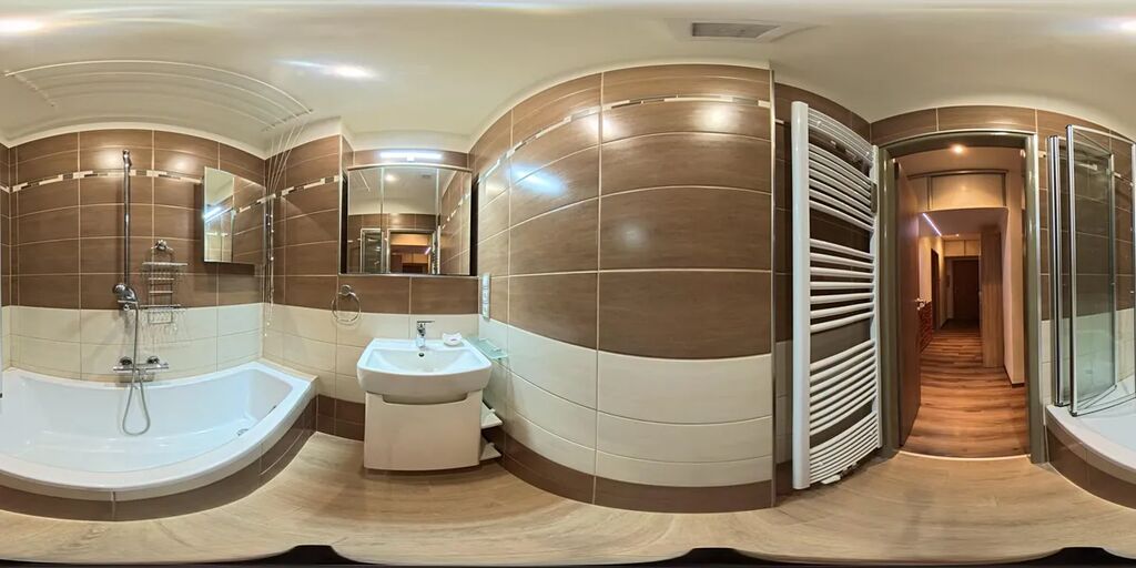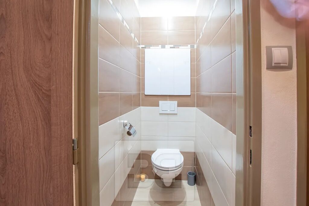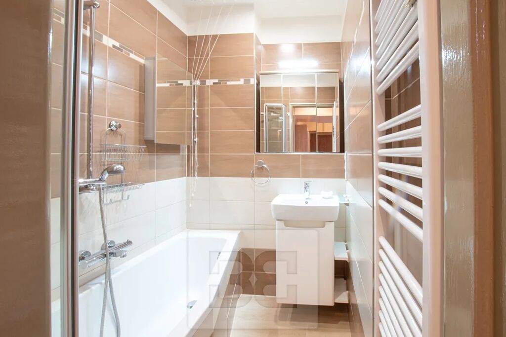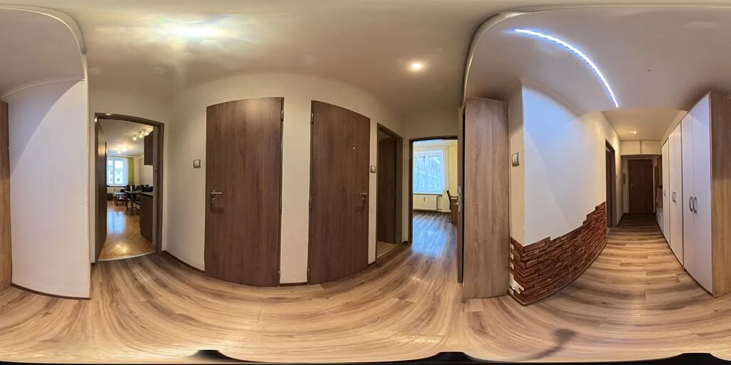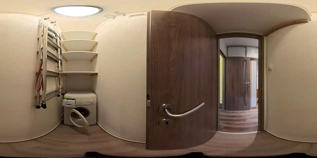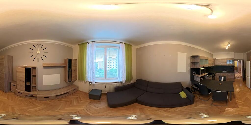 Byt je světlý, s dřevěnými podlahami v obývací místnosti a kvalitním vinylem v ostatních místnostech. Kuchyňský kout je vybaven moderní linkou se spotřebiči, včetně lednice s mrazákem, varné desky, trouby, digestoře a mikrovlné trouby. Dále v obývací místnosti najdeme rozkládací pohovku, jídelní stůl a obývací stěnu. V bytě se nachází dva samostatné pokoje. Jeden z nich nebízí pracovní stůl, ve druhém najdeme šatní skříň a prostornou postel. V koupelně najdeme vanu. Toaleta je umístěna samostatně. Součástí bytu je také prostorná komora, která může sloužit jako šatna nebo úložný prostor, zde najdeme úložný systém polic a pračku. V předsíni jsou další skříně.