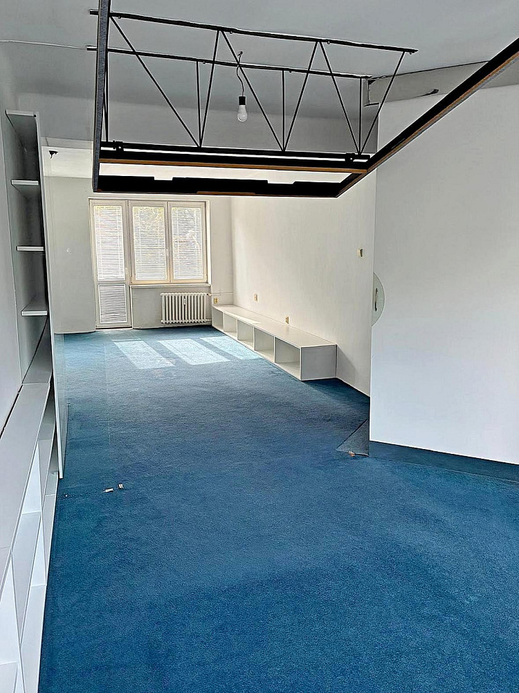 Po vstupu do bytu vás přivítá předsíň laděná do elegantní šedé barvy, zde je vstup do samostatného WC s malým umyvadlem, rovněž v šedém tónu. Kuchyně je v moderním černém designu, vestavěné spotřebiče jako myčka, pračka, mikrovlnná trouba a lednička vytvářejí prostor, kde je radost vařit i trávit čas. Koupelna je stylová a neotřelá – modrá vana, plechové umyvadlo a šedé kachličky tvoří harmonický celek, který zaujme každého milovníka designu. Hlavní obytný prostor vznikl spojením dvou pokojů do jednoho velkého, vzdušného celku. Díky chytrému řešení je možné prostor kdykoliv rozdělit – pomocí stropní zástěny a zasouvací zrcadlové stěny si vytvoříte soukromí podle potřeby.