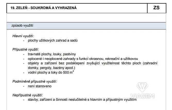 Dle platného územního plánu je zde možné pozemek oplotit a využít ho k rekreačním účelům – ideálně pro založení zahrady, ovocného sadu nebo klidného místa k odpočinku. Na pozemku je možné umístit maringotku, zahradní domek, pergolu, bazén či jiný lehký zahradní objekt. Výhodou je možnost připojení na elektřinu. Voda a kanalizace v této části obce k dispozici nejsou.