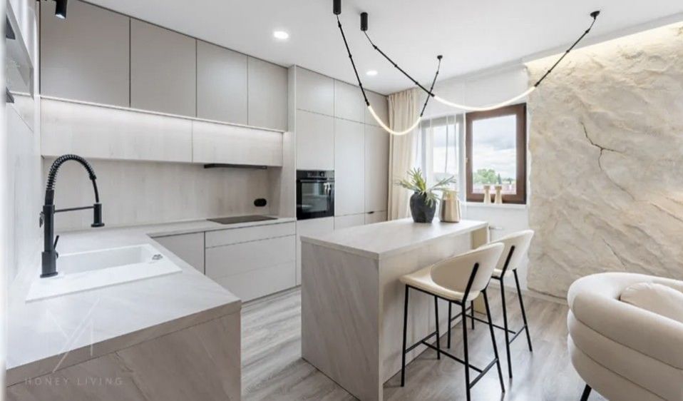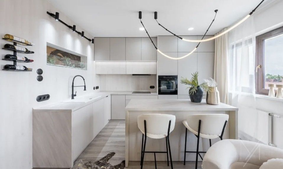 Kuchyň na míru je nadstandardně prostorná a nabízí dostatek pracovních ploch i úložného prostoru. Součástí je i ostrůvek, který lze využít k vaření, či stolování. Vybavena je spotřebiči značky Gorenje - indukční varná deska, trouba, myčka, digestoř.