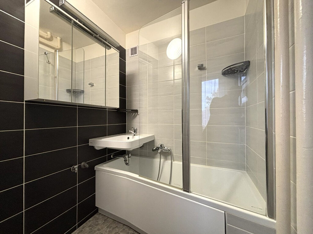 V koupelně je vana se zástěnou a umyvadlo s osvětlenou zrcadlovou galerií.