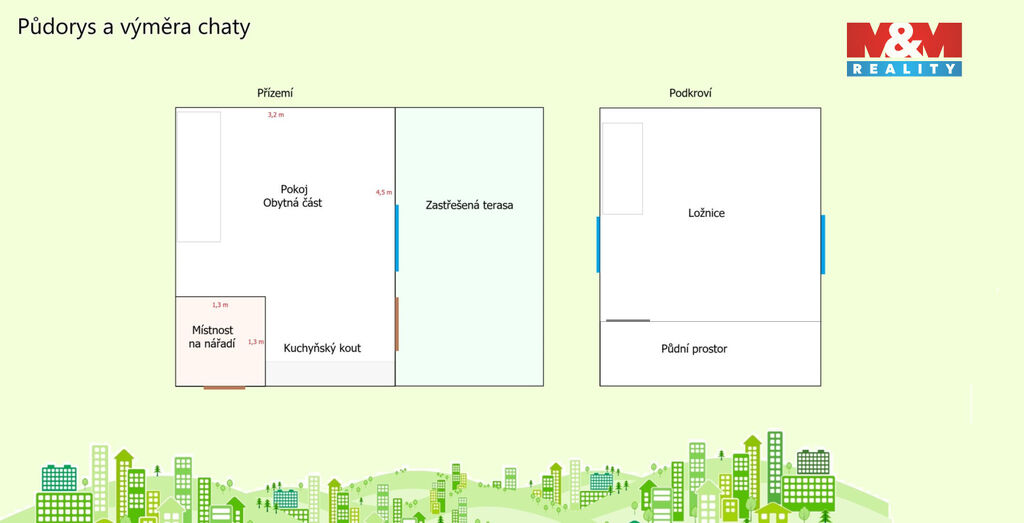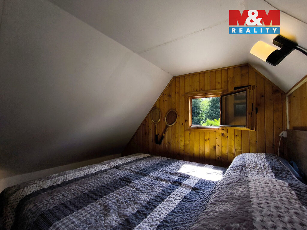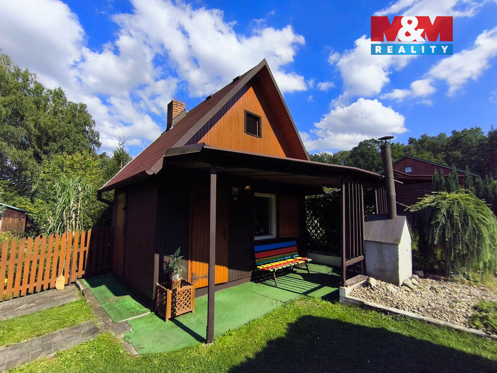 Součástí je patrová chata se zastavěnou plochou 16 m², betonovým základem a menším sklepem. V přízemí se nachází kuchyňský kout s obytnou místností, v podkroví ložnice. Díky zděnému komínu lze objekt využívat i mimo letní sezónu. K chatě navazuje zastřešená pergola, ideální pro posezení s rodinou nebo přáteli. Nechybí ani úložný prostor na nářadí.