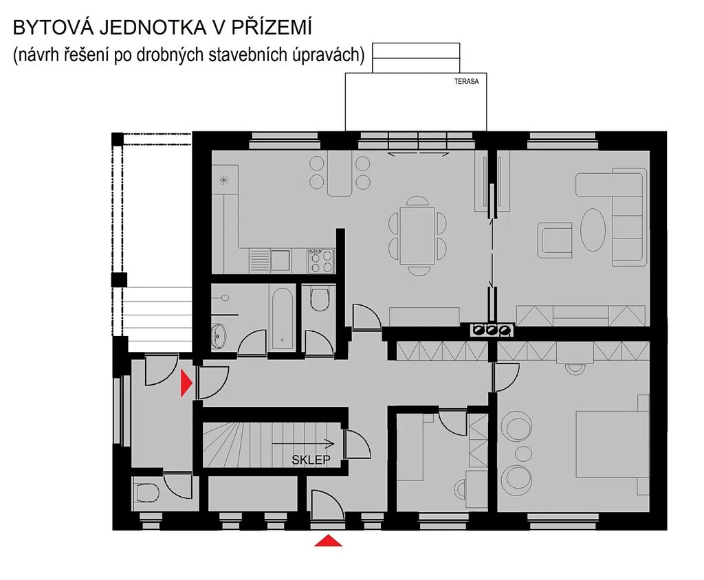V grafické části inzerce se nachází variantní řešení úpravy bytu s tím, že stavební dílo v následujícím rozsahu: