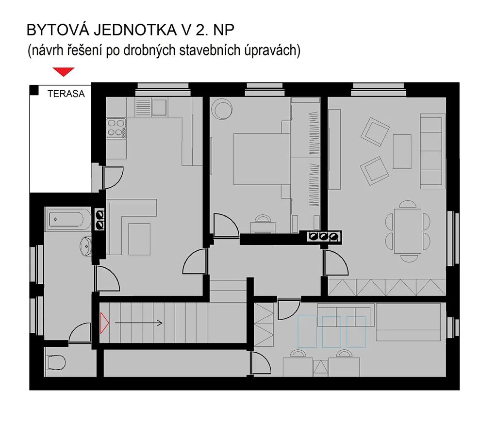 V grafické části inzerce se nachází variantní řešení úpravy bytu s tím, že stavební dílo v podobě vybourání a nového osazení příček a vestavba střešních oken v dětském pokoji bylo osloveným dodavatelem naceněno na 188.300,- Kč. Výměna stávajících oken domu za nová plastová a podíl na zateplení obvodového pláště ve výši 387.000,- Kč. Na tuto část rekonstrukce lze aktuálně čerpat dotaci z programu Nová zelená úsporám.