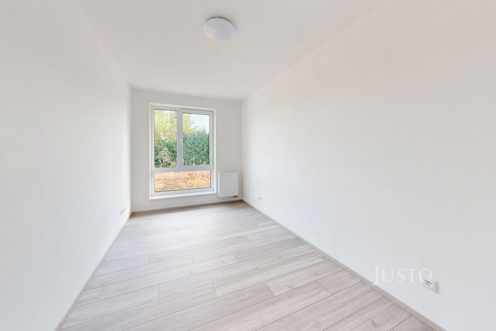 Dominantou bytu je světlý obývací pokoj s kuchyňským koutem o ploše 23,1 m² s přímým vstupem na terasu orientovanou na jih, odkud si můžete užívat příjemný výhled do zeleně. Kuchyňská linka je vybavena moderními spotřebiči – myčkou, elektrickou varnou deskou, troubou a mikrovlnnou troubou. Byt nabízí také samostatný pokoj (12,3 m²), vhodný jako ložnice nebo pracovna.