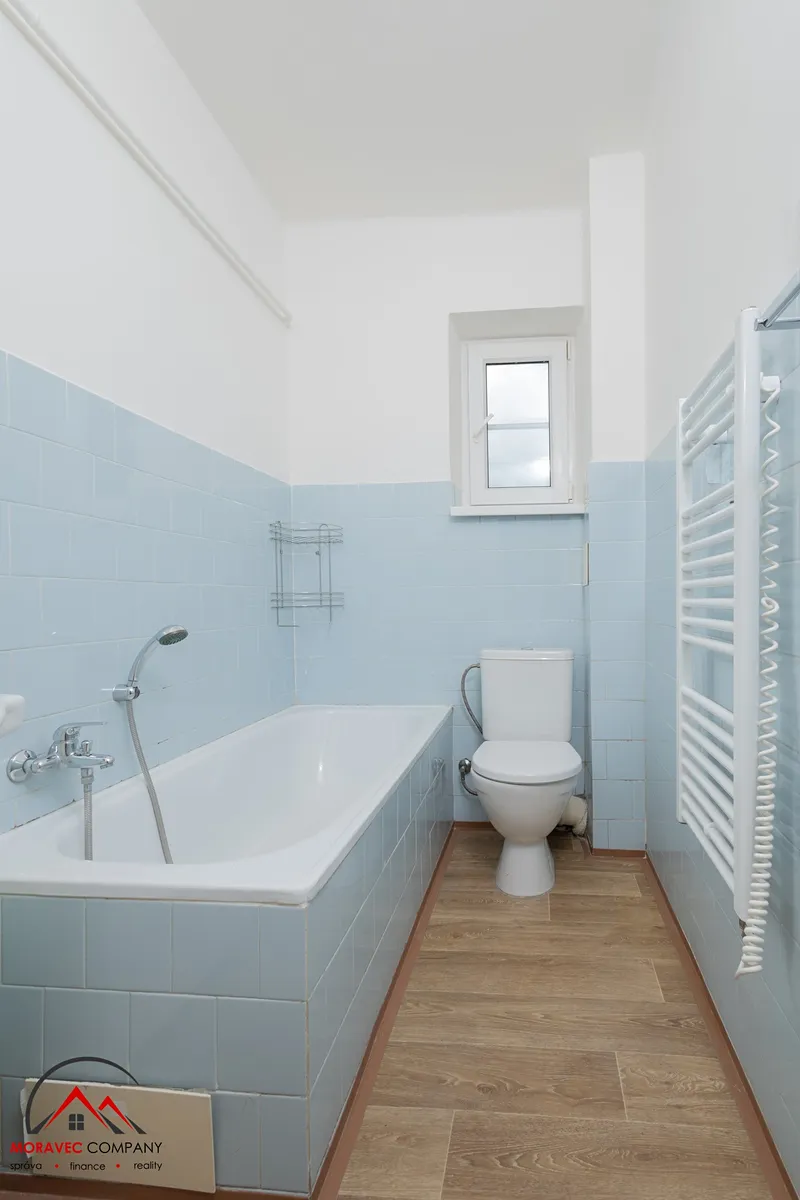 V bytě je kuchyně s kombinovaným sporákem a spižírnou, dále samostatný pokoj a koupelna s vanou, praktickými úložnými skříňkami a WC. Vytápění zajišťují plynové gamaty, ohřev vody je řešen elektrickým bojlerem.