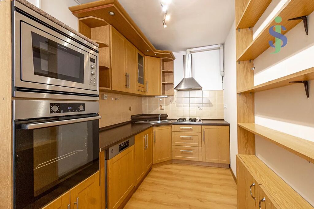 V bytě je kuchyňská linka, včetně el. trouby, plynového sporáku a myčky nádobí.