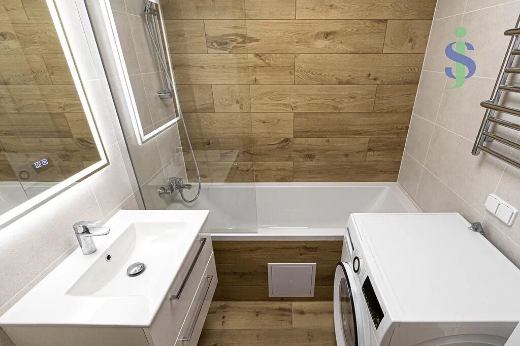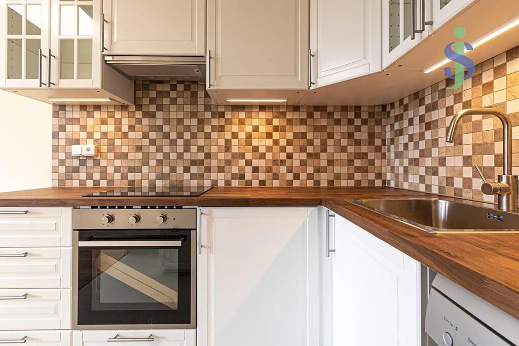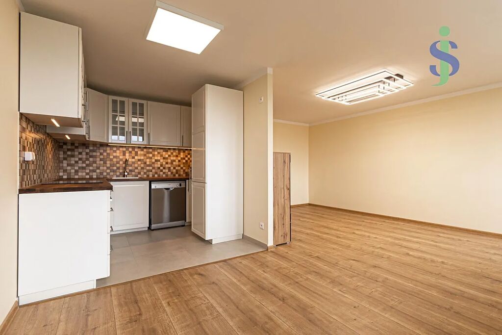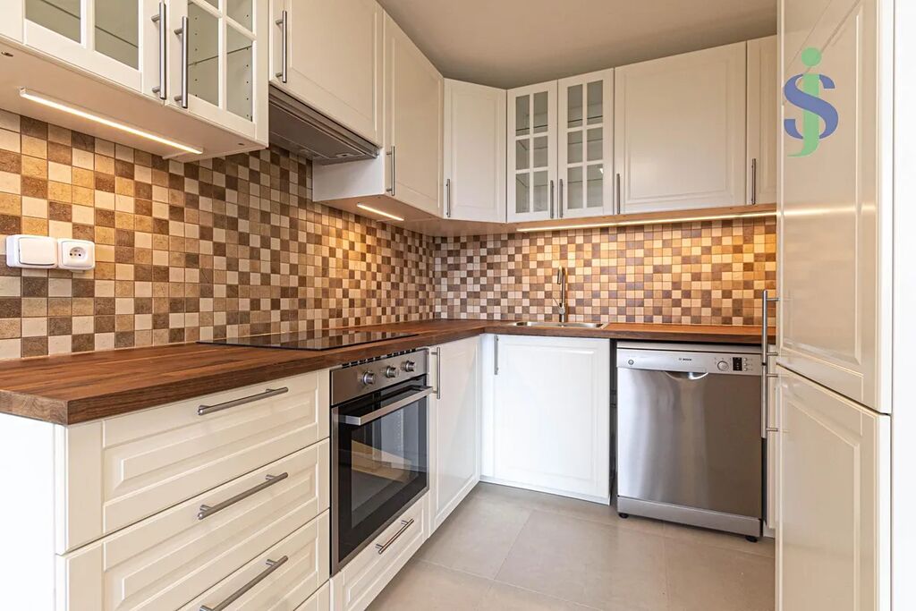 V bytě je nová kuchyňská linka, včetně el. trouby a myčky nádobí.