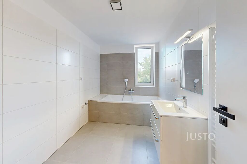 V koupelně najdete vanu, umyvadlo, WC a prostor pro pračku, vše v nadčasovém a elegantním provedení. V bytě jsou plastová okna, kvalitní podlahy a ústřední plynové vytápění s radiátory. K bytu náleží sklep (1 m²) a vlastní garážové parkovací stání přímo v domě.