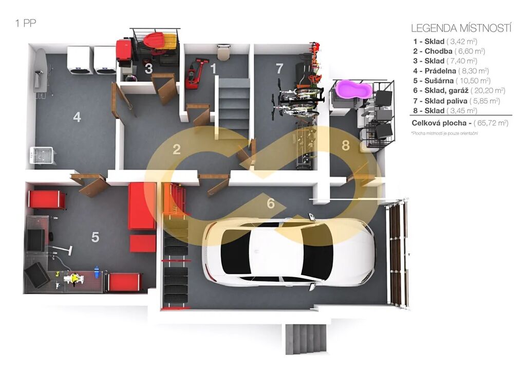 V suterénu je garáž, kde zaparkujete a uložíte nářadí nebo sportovní vybavení. Jsou tu také technické místnosti – prádelna, sušárna a kotelna se skladem na palivo.