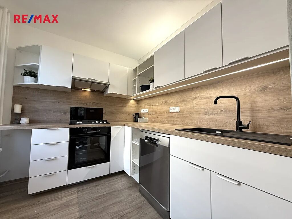 nová moderní kuchyňská linka se spotřebiči (plynová deska Mora, horkovzdušná trouba Mora, myčka Bosch, digestoř, fragranitový dřez, LED podsvícení)