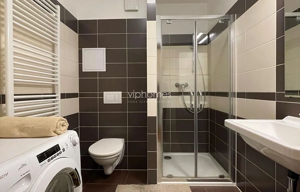 Koupelna se sprchovým koutem, toaletou, pračka se sušičkou.