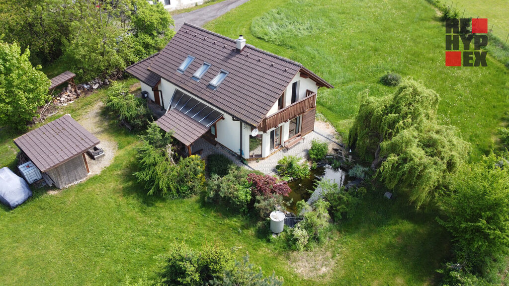 Na profesionálně udržované zahradě se nachází pergola, zahradní domek s ohništěm, bazén 6 x 3 m, terasa s posezením u jezírka, garáž, přístřešek pro auta a dostatek prostoru pro parkování.