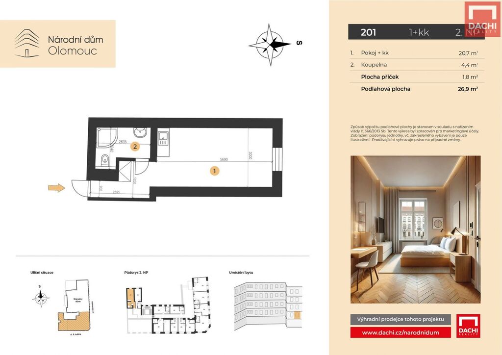 V rámci projektu nabízíme byt č. 201 o dispozici 1+kk s podlahovou plochou 26,9m, který se nachází ve 2. nadzemním podlaží.
