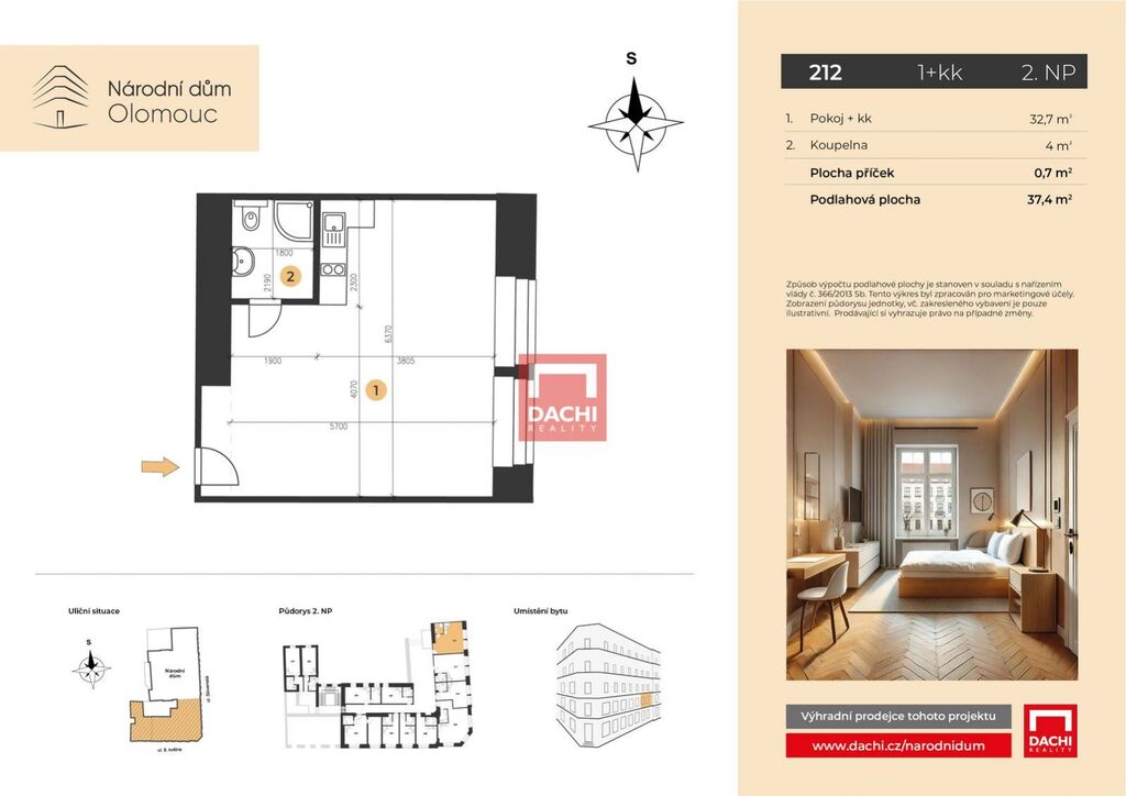 V rámci projektu nabízíme byt č. 212 o dispozici 1+kk s podlahovou plochou 37,4m, který se nachází ve 2. nadzemním podlaží.