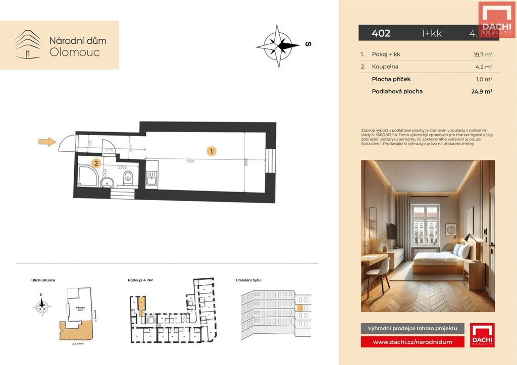 V rámci projektu nabízíme byt č. 402 o dispozici 1+kk s podlahovou plochou 24,9 m, který se nachází ve 4. nadzemním podlaží.
