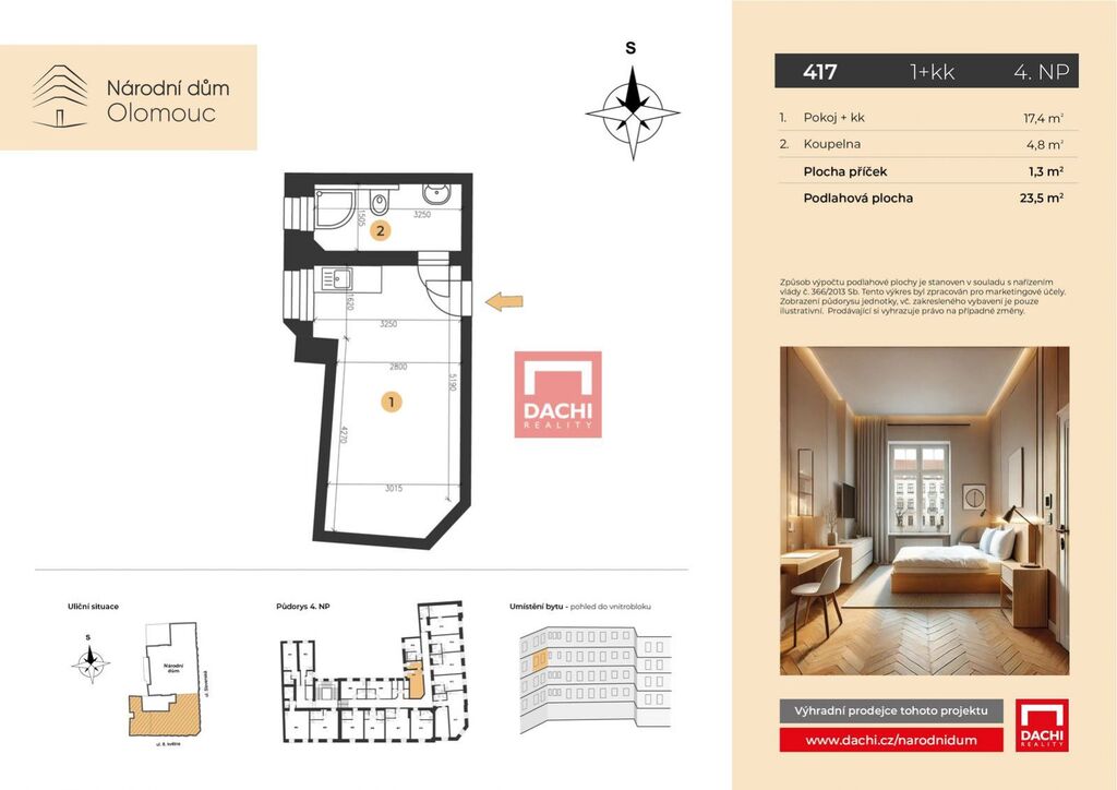 V rámci projektu nabízíme byt č. 417 o dispozici 1+kk s podlahovou plochou 23,5m, který se nachází ve 4. nadzemním podlaží.