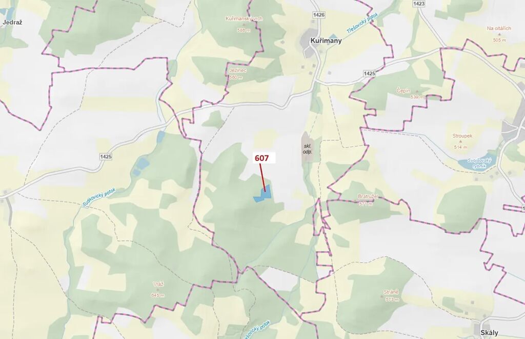Lesní pozemek o výměře 10 437 m2, parcelní číslo 607, podíl 1/1, katastrální území Kuřimany, obec Kuřimany, obec s rozšířenou působností Strakonice, okres Strakonice, Jihočeský kraj. Částečně po těžbě.