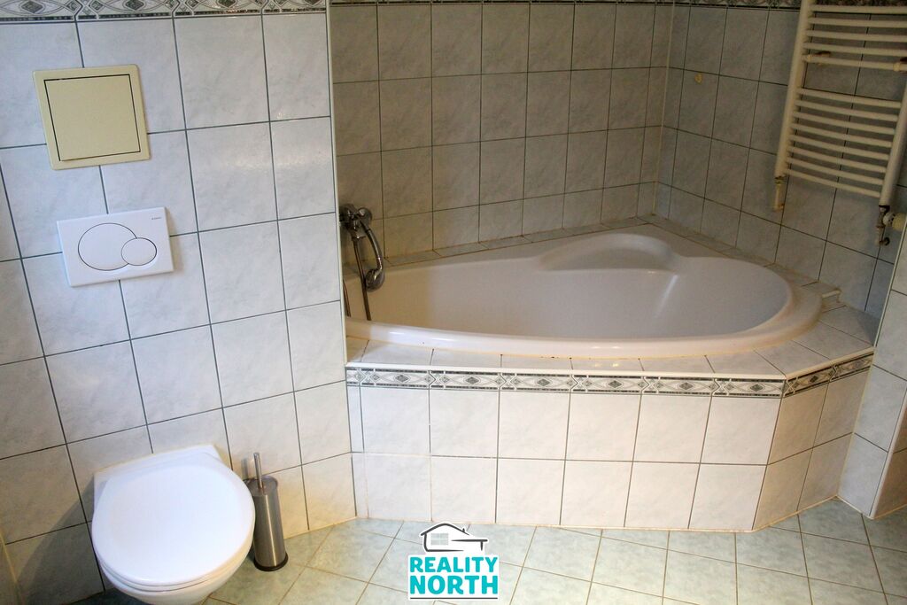Koupelnové jádro je zděné s rohovou vanou, umyvadlem a WC.