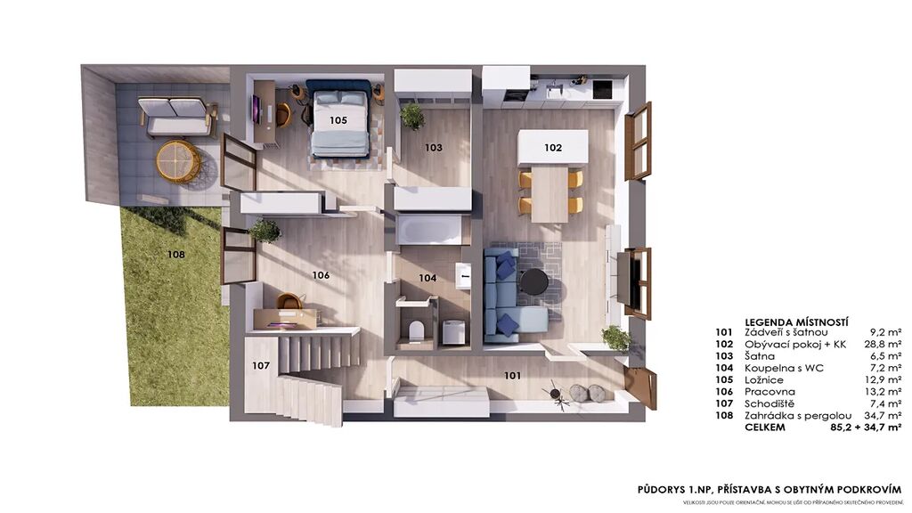 S užitnou plochou 66 m² a malým nádvoříčkem s příjemným posezením pod pergolou nabízí tento dům skvělou kombinaci útulnosti a funkčnosti pro mladou rodinu, nebo pro seniory, kterým vytvoří útulné prostředí pro odpočinek i pobyt na čerstvém vzduchu.