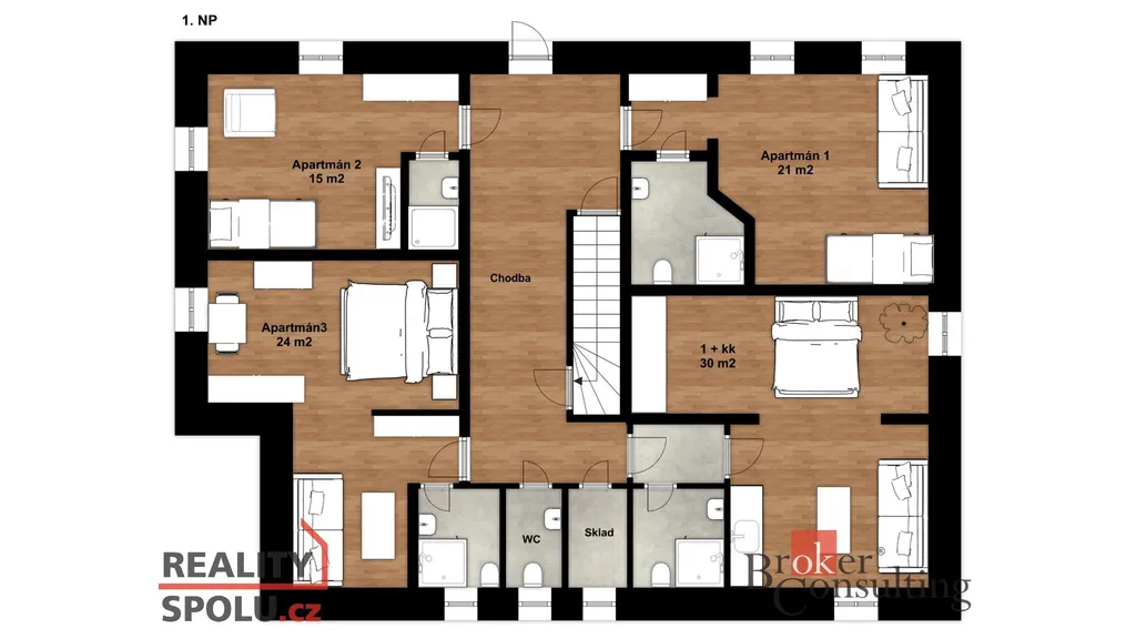 - 1NP nabízí byt 1+kk o výměře 30m2 a penzion o 3 pokojích se sociálním zařízením pro 10 osob.
