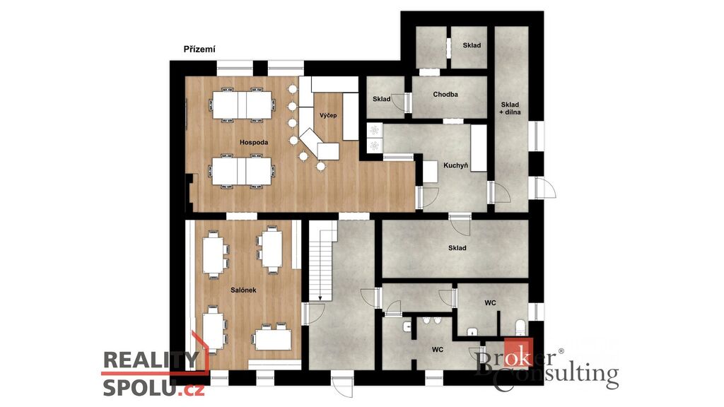 - V přízemí se pak nachází stylová hospůdka se salonkem pro 40 osob, zázemí kuchyně