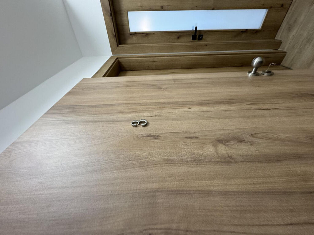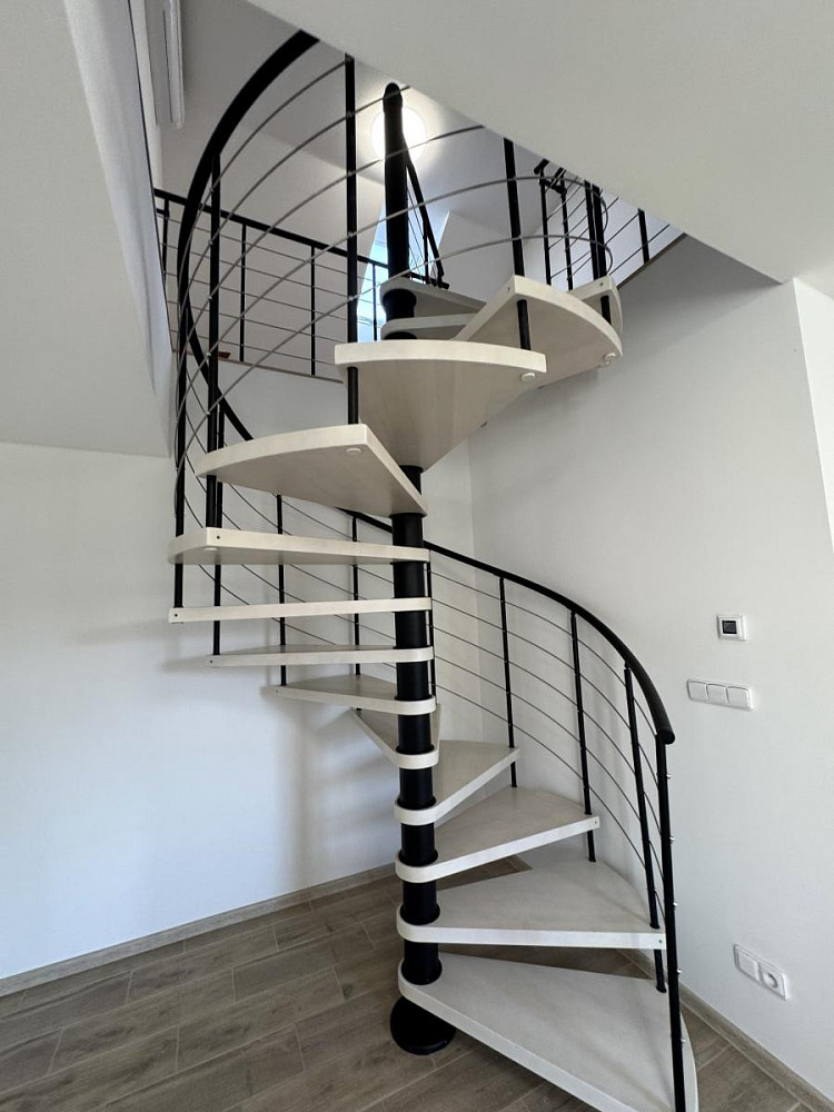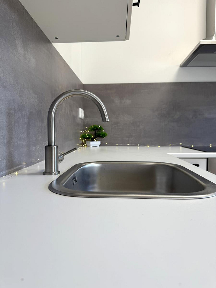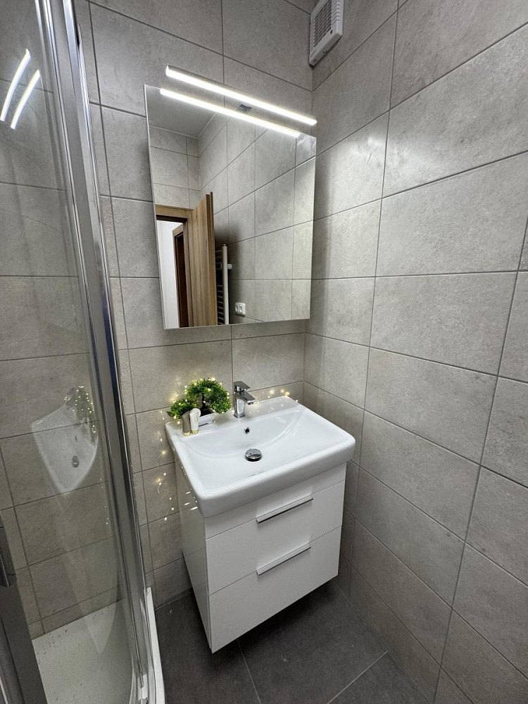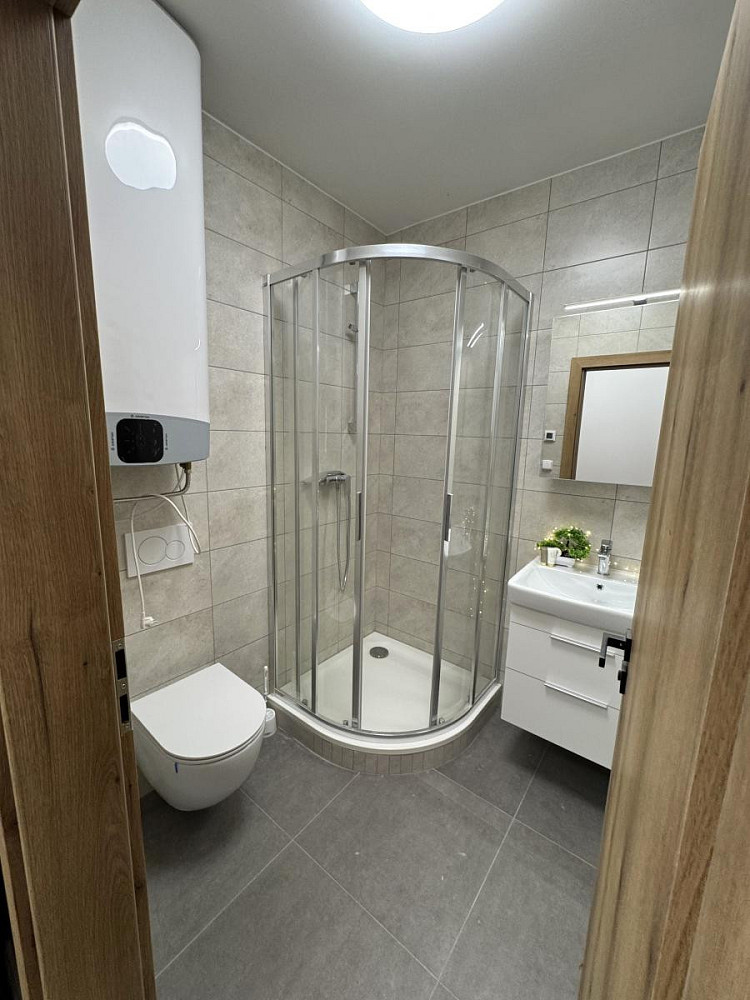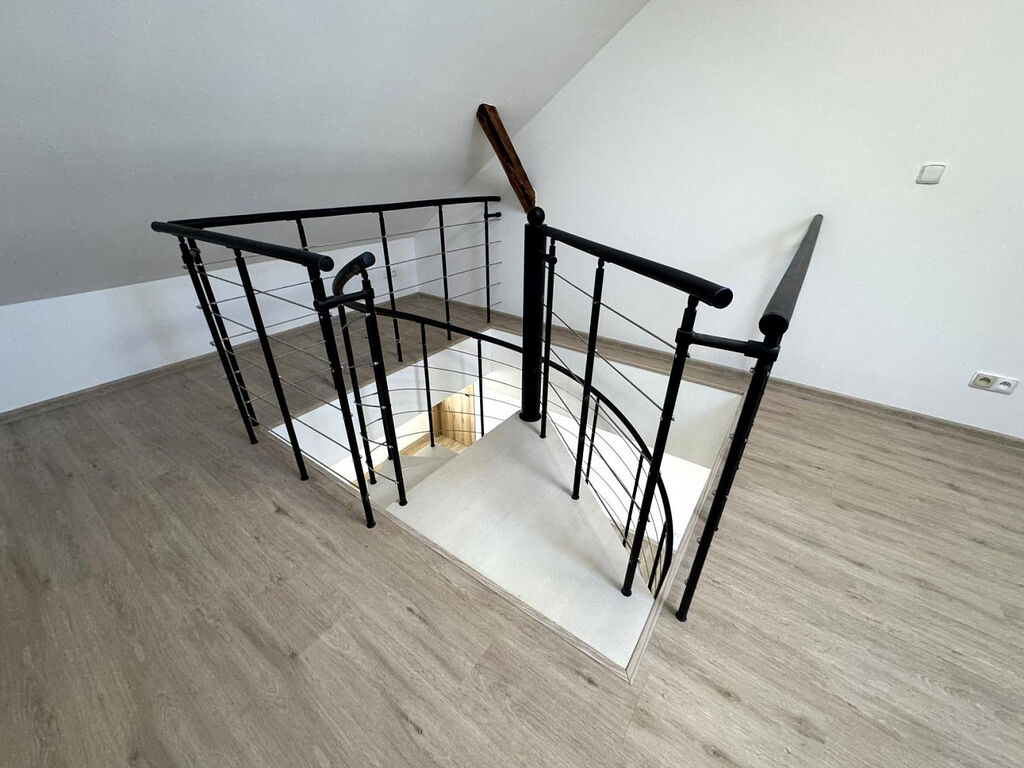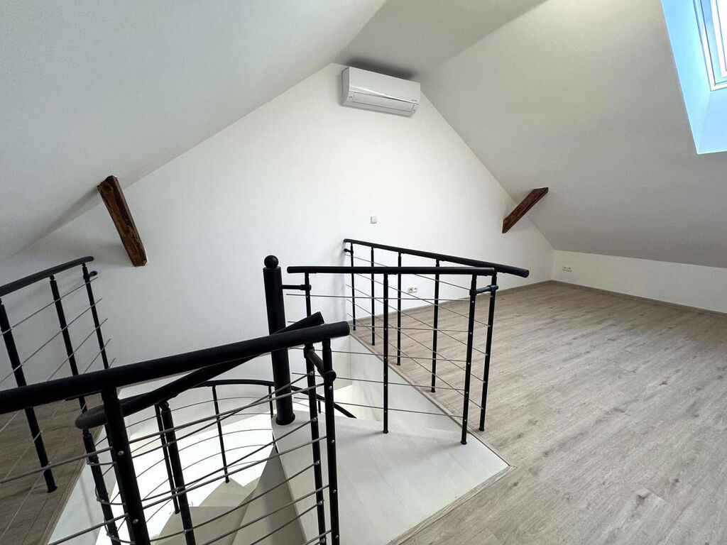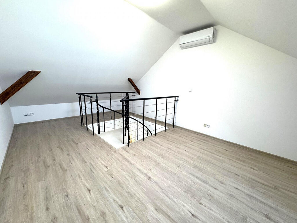 Za vchodovými dveřmi se ocitneme v prostorné chodbě (cca 3,14 m²), ze které je vstup do velké koupelny (cca 2,65 m²). Koupelna s WC je vybavena umyvadlovou skříňkou, umyvadlem, velkým zrcadlem, WC a sprchovým koutem. Hlavní dominantou bytu je pokoj s kuchyňským koutem (cca 24,10 m²), který disponuje novou kuchyňskou linkou, jejíž součástí je digestoř, elektrická trouba, elektrická sklo-keramická deska a pračka. Lednička s mrazákem zde není, ale majitel v případě zájmu lednicí s mrazákem byt dovybaví. V tomto pokoji je také široké točité schodiště vedoucí do mezonetu, kde je pokoj (galerie) o výměře (cca 21,39 m²) s přiznanými trámy a střešním oknem. V místnosti je klimatizace značky LG, která chladí i vytápí. V přízemí nesmíme opomenout ani další samostatný pokoj (cca 13,21 m²), který může sloužit jako obývací, ale i jako ložnice.