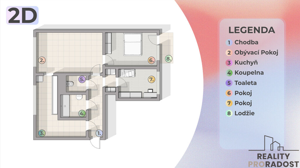 Dispozice bytu je řešena prakticky: po vstupu do prostorné chodby s vestavěnými skříněmi se vlevo nachází kuchyně propojená průchodem s obývacím pokojem. Vpravo od chodby jsou umístěny dva samostatné pokoje, z nichž jeden má přístup na lodžii, ideální pro relaxaci.