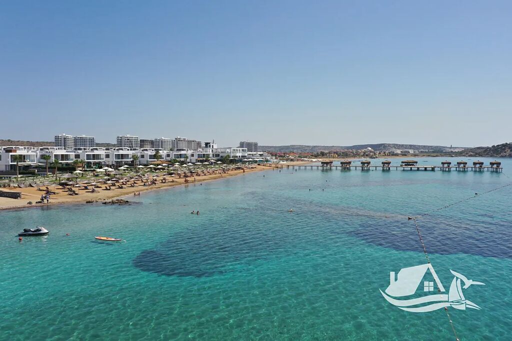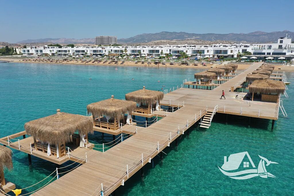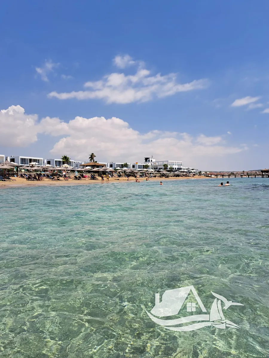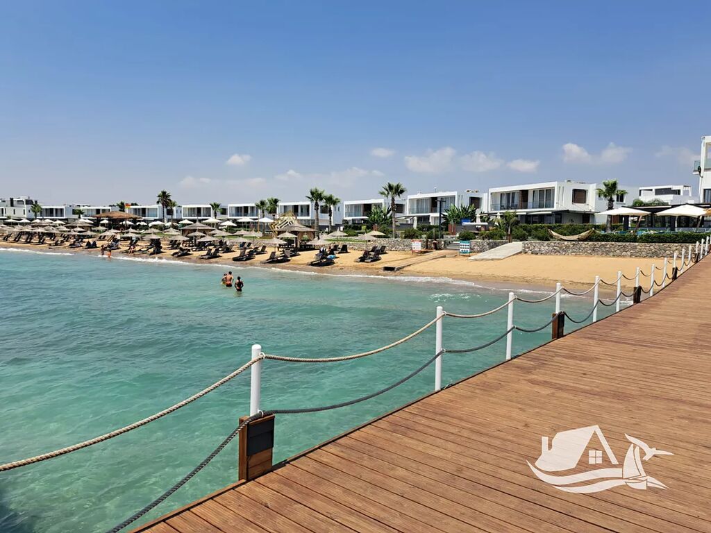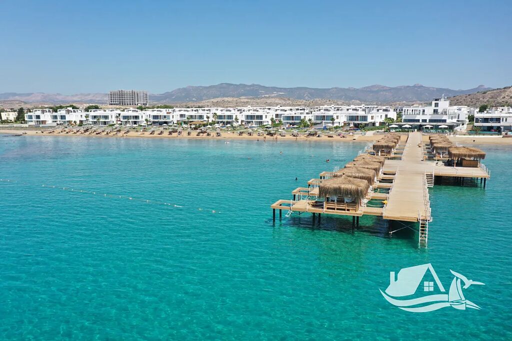 Obrovskou výhodou je fakt, že resort má vlastní pláž, kde jsou lehátka a domečky určené pro residenty projektu. Je zde nově i krásné molo s lehátky a boxy, kde si můžete objednat například osvěžující drink. Vstup na pláž je řešen podchodem pod silnicí. Podobných resortů je na Kypru velmi málo.
