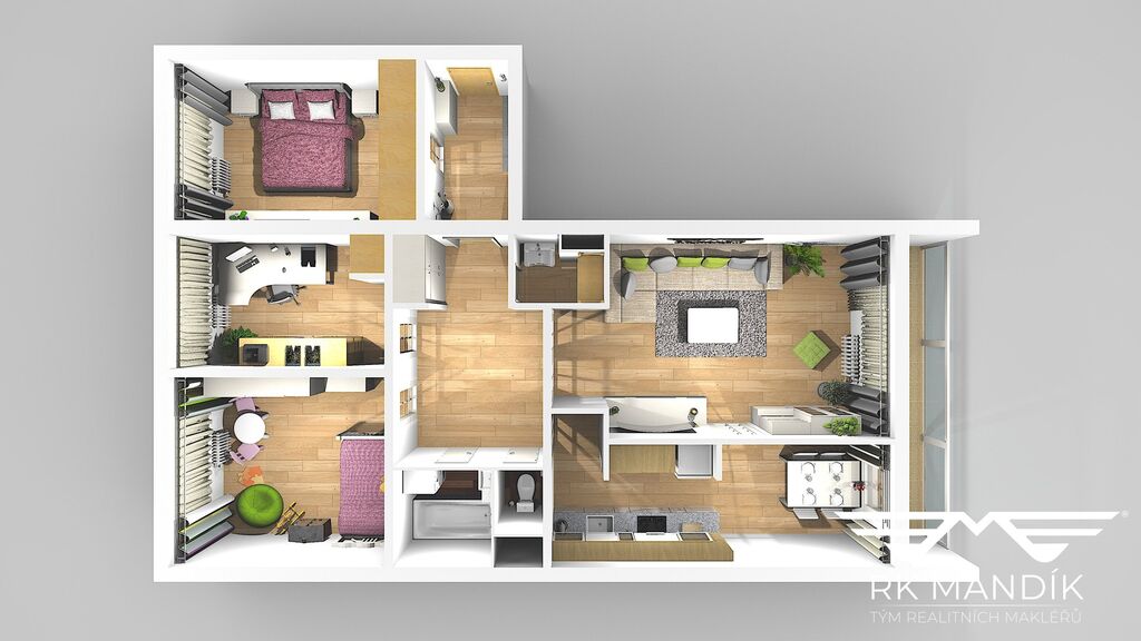 Skládá se z obývacího pokoje orientovaného na jihozápad se vstupem na lodžii, kuchyně (s možností změny dispozice probouráním příčky na 4+kk), třemi neprůchozími pokoji orientovanými na severovýchod, chodbou a technickou místností. Dále koupelnou s vanou, která je stavebně oddělena od toalety.