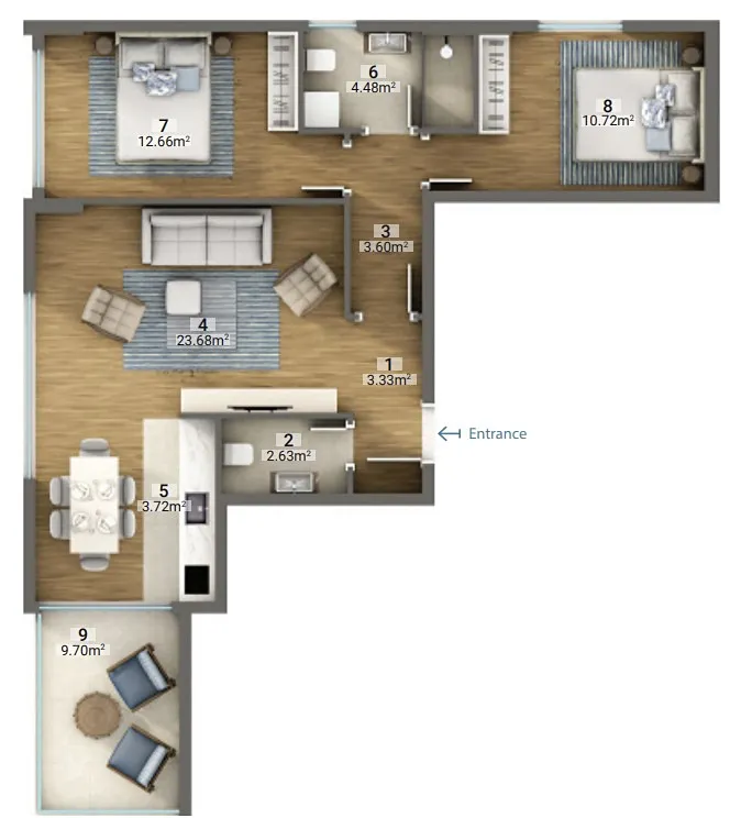 Apartmán disponuje prostorným obývacím pokojem s panoramatickými okny a kuchyňským koutem, dvěma moderními ložnicemi, elegantní koupelnou a soukromou terasou o rozloze 46,94 m². Celková plocha jednotky činí 67,58 m².